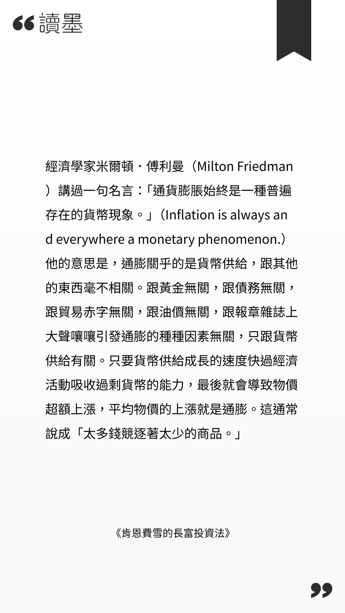 費雪並沒有著墨在經濟學的定義,而是直接說成投資人聽得懂的版本:通膨不是因為壞人、戰爭或油價,而是因為錢變多得比商品快。