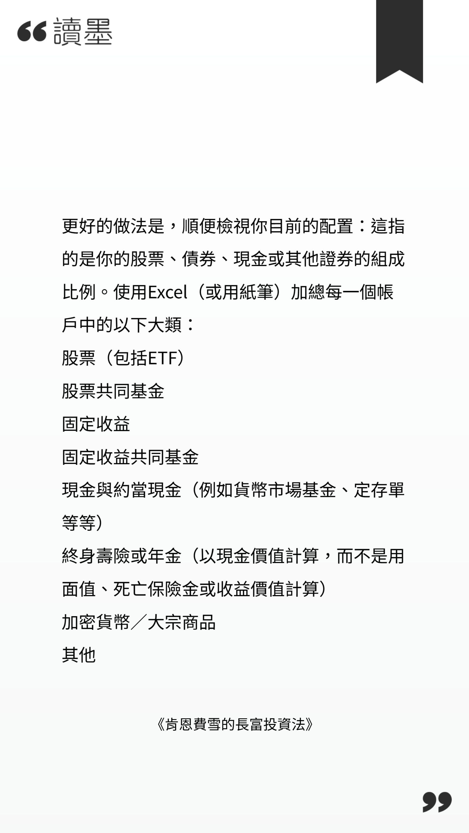 這也是為什麼他建議投資人先盤點整體資產配置——包括股票、債券、現金、保險、甚至加密資產——而不是只盯著某一個帳戶、某一檔金融商品。這個觀點對理財新手尤其重要,因為它把「投資」從商品選擇到挑選股票,重新拉回到人生整體的設計。