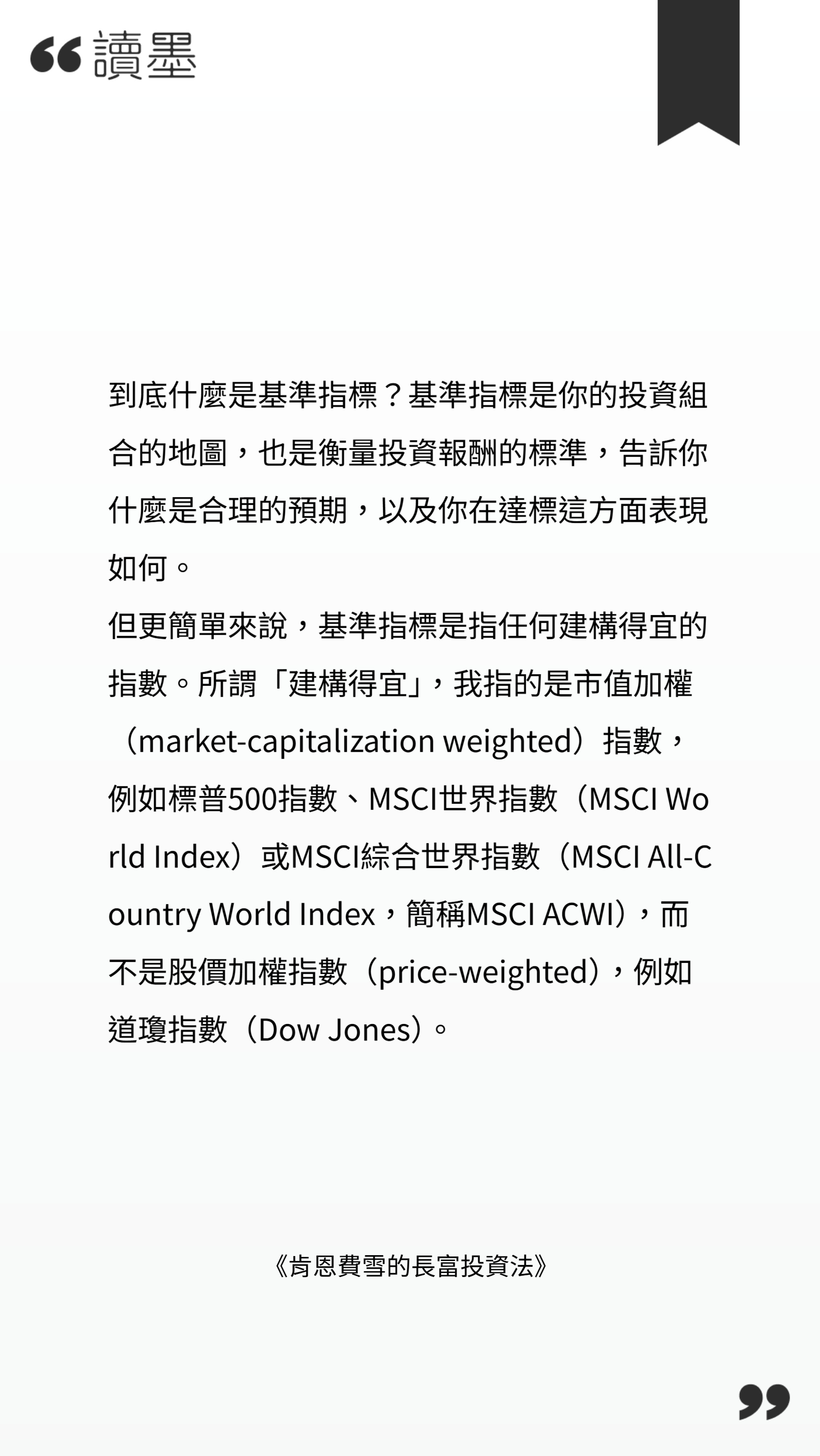 他在書特別強調,適合多數長期投資人的基準,應該是市值加權的廣泛市場指數,例如標普 500 或 MSCI 世界指數,而不是價格加權、或高度集中、或帶有強烈敘事偏誤的指數。這點很多理財新手甚至投資老手並不清楚benchmark其實就是我們的機會成本。