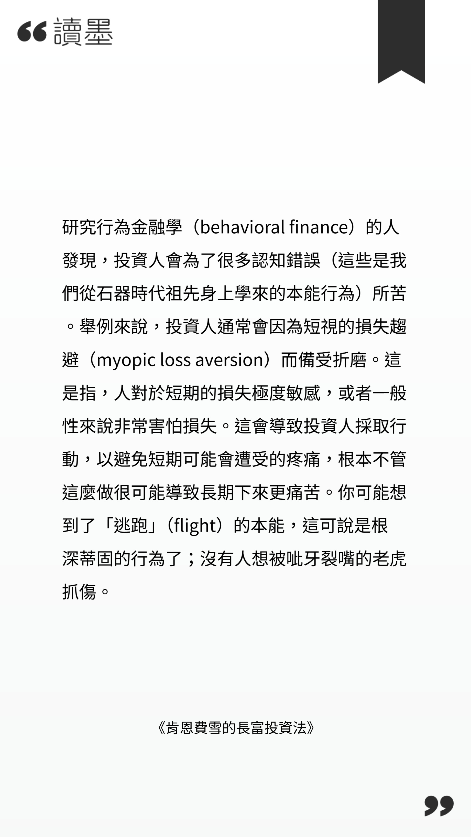 其中他談到的「短視損失趨避(myopic loss aversion)」尤其關鍵。簡單來說,就是我們對短期損失極度敏感,敏感到願意犧牲長期利益,只為了逃避眼前的不舒服。