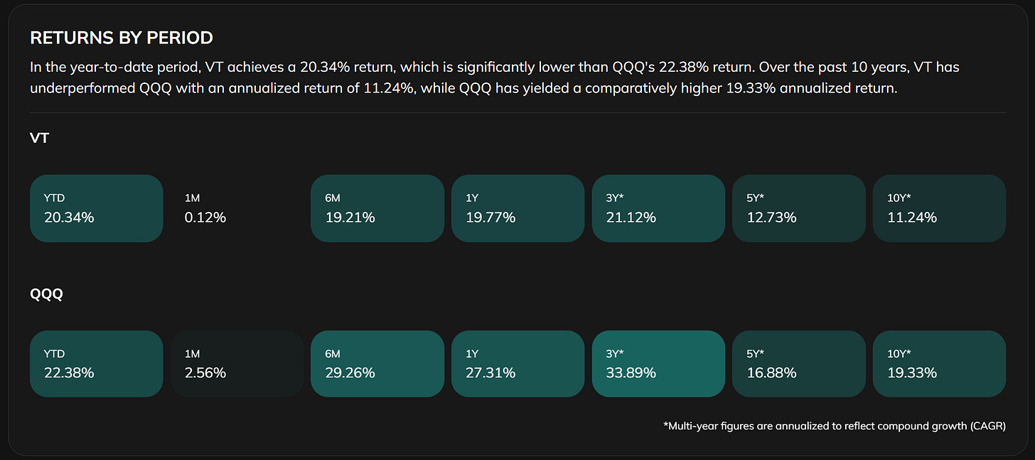因此,從配置角度來看,QQQ 是高波動、高集中度的「科技核心」,而 VT 是更平衡、全球分散的「全市場代表」。兩者的組合差異,正是「集中成長」與「分散防禦」之間的取捨。