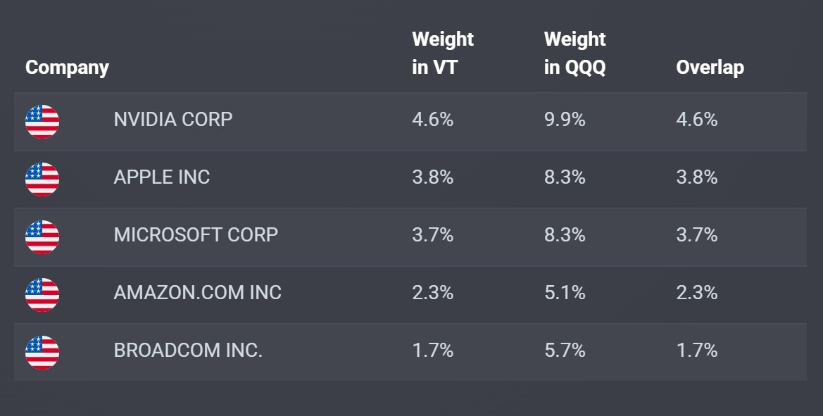 這是因為 VT 涵蓋全球市場(美國、歐洲、日本、新興市場),持股分散非常廣;QQQ 則專注在美國那一小塊、尤其是科技龍頭。在 VT 與 QQQ 的重疊部分中,前五大共同持股分別是 NVIDIA、Apple、Microsoft、Amazon 與 Broadcom。這五家公司在兩檔 ETF 中的權重皆名列前茅,代表了美股的核心科技力量。