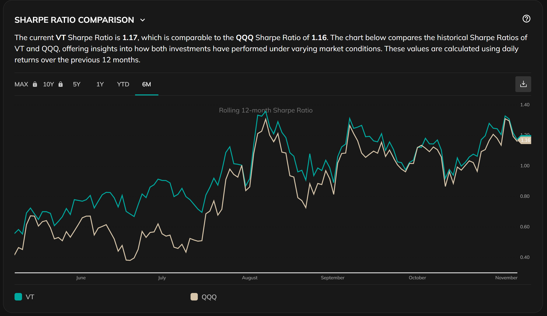 從風險報酬效率來看,Sharpe Ratio 為 1.17 (VT) 對比 1.16 (QQQ),幾乎打平,代表兩者在「每承擔一單位風險可獲得的報酬」上表現相近。進一步觀察 Sortino Ratio,兩者皆為 1.72,顯示在下行波動的情況下,報酬穩定度幾乎一致。