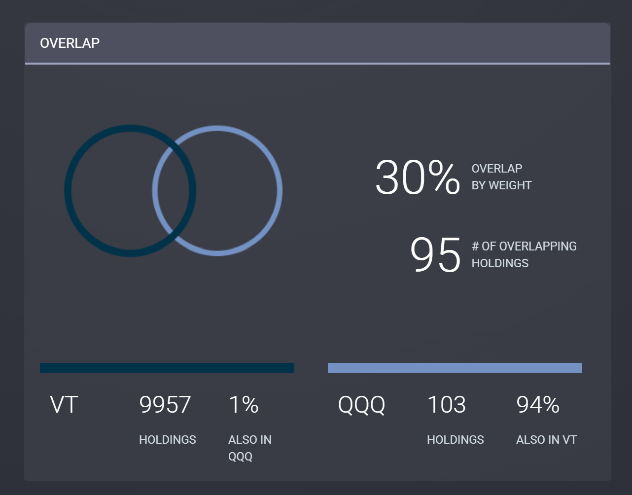 代表 VT 和 QQQ 的整體資產配置有三成是同樣的公司。也就是說,如果你同時持有兩者,有 30% 的資金其實是壓在同樣的股票上。重疊持股數(Overlapping Holdings)共 95 檔: