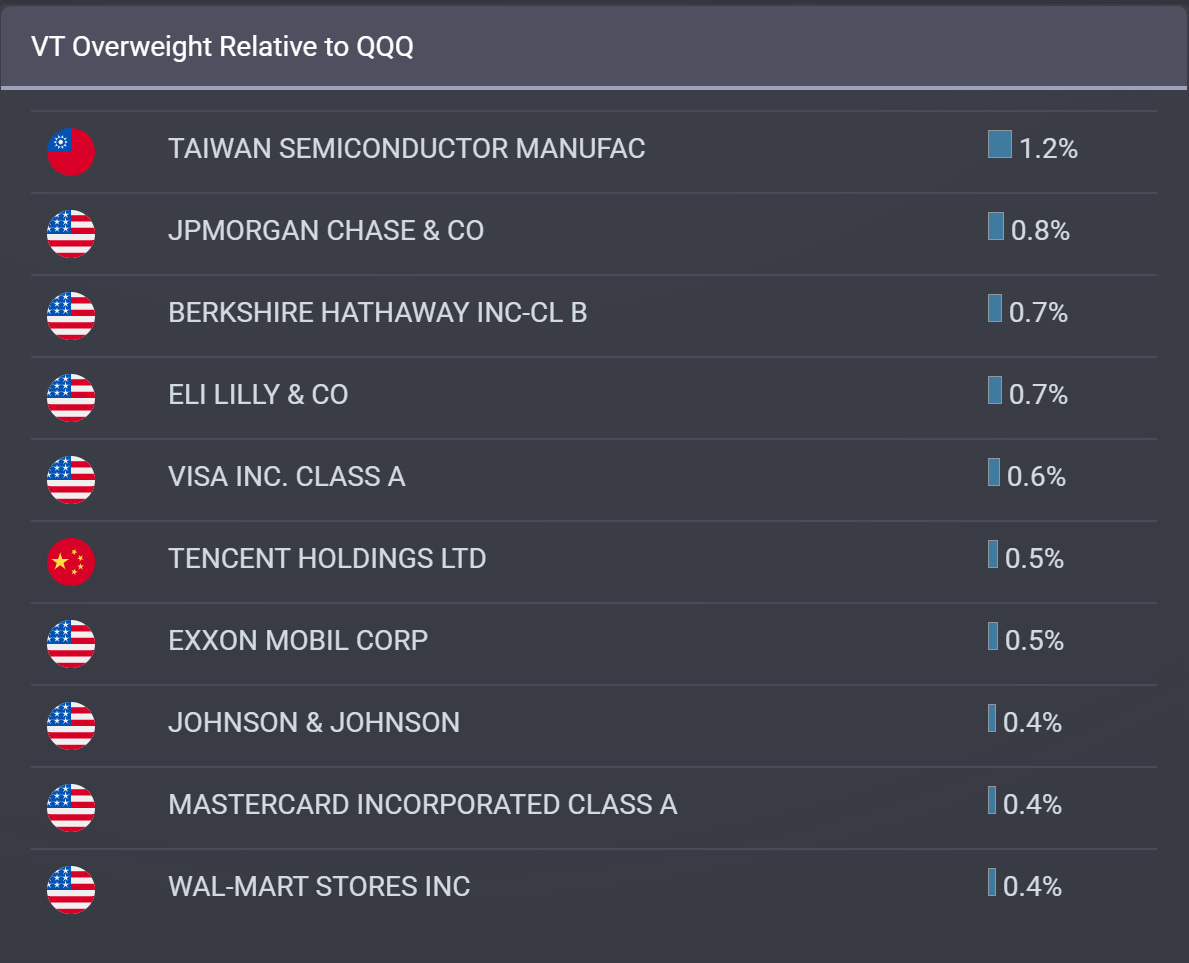 因此,這份超配清單說明了 VT 的結構優勢──它不僅包含 QQQ 的科技龍頭,也同時補上了防禦性與區域分散的缺口,讓投資組合在景氣循環或科技股回調時更具穩定性。