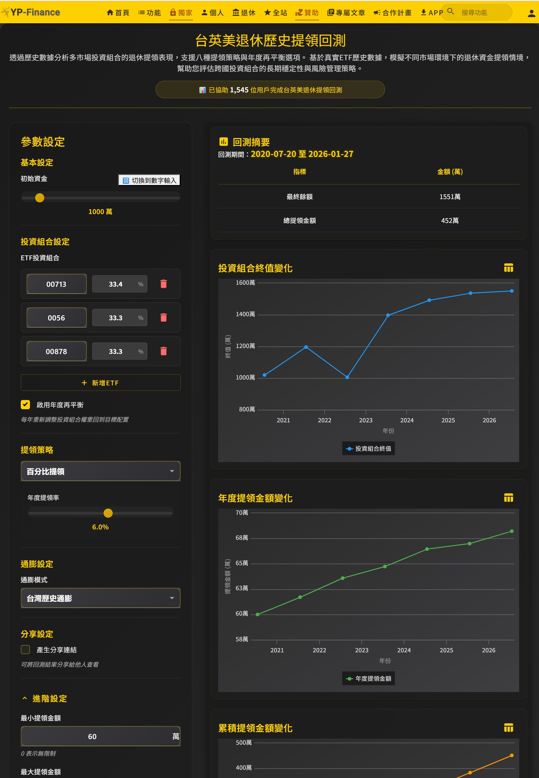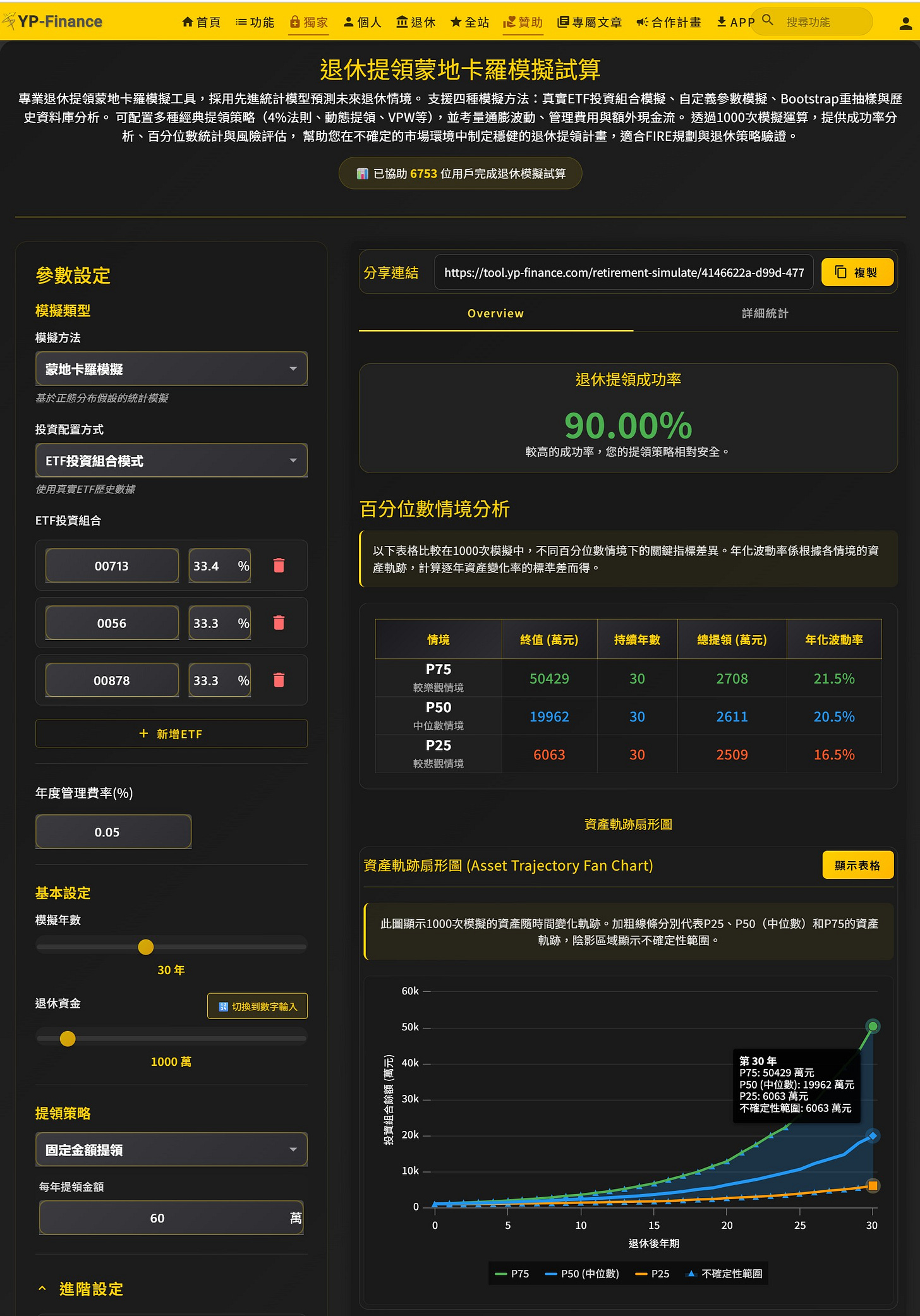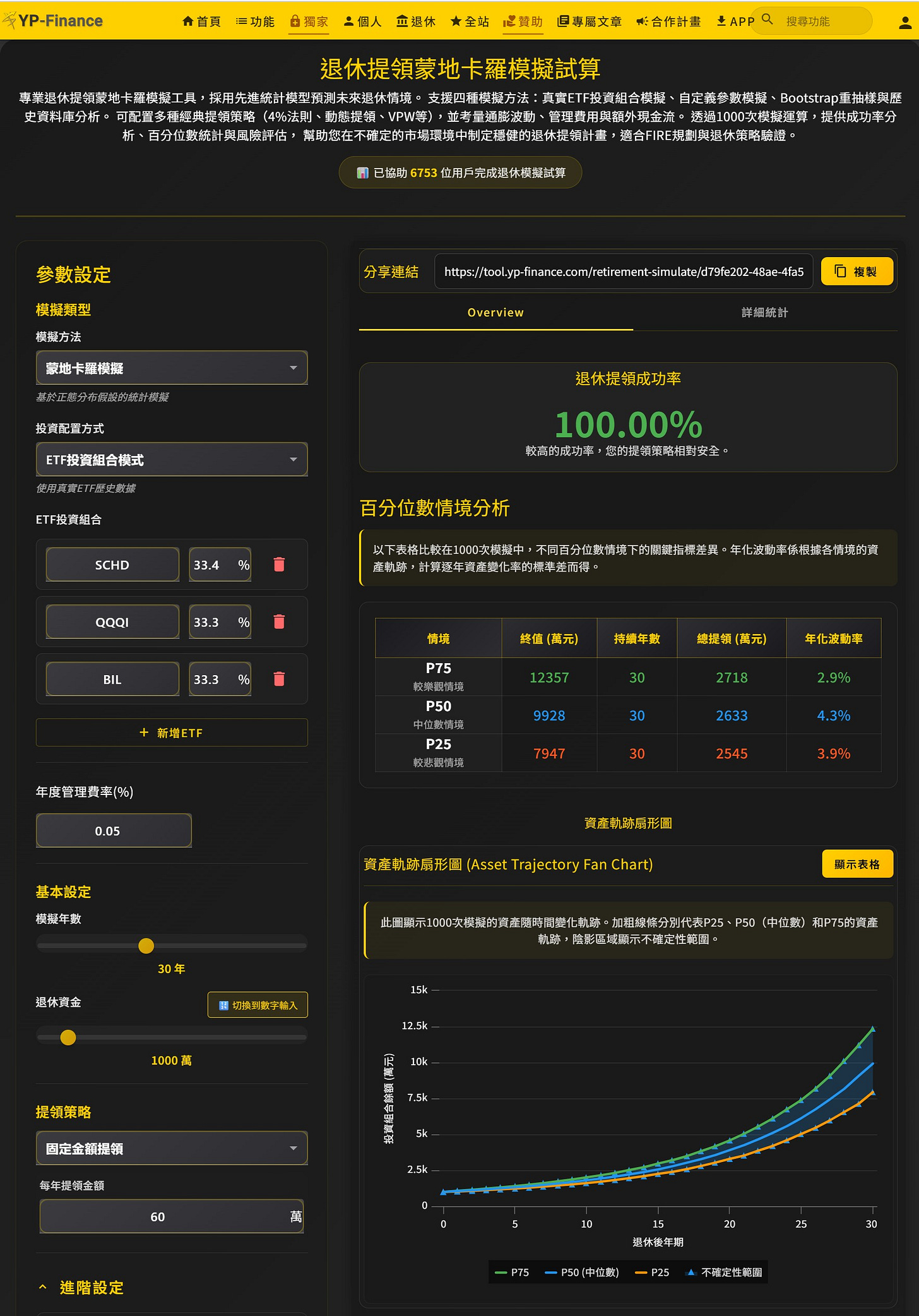 到目前為止,我們談的仍然是「邏輯上是否合理」。但退休投資有一個無法迴避的問題是:合理不等於撐得住。因此,接下來我會把 Justin 的台股及美股退休配置,實際放進情境中檢視,透過 YP 指投網 提供的兩種工具: