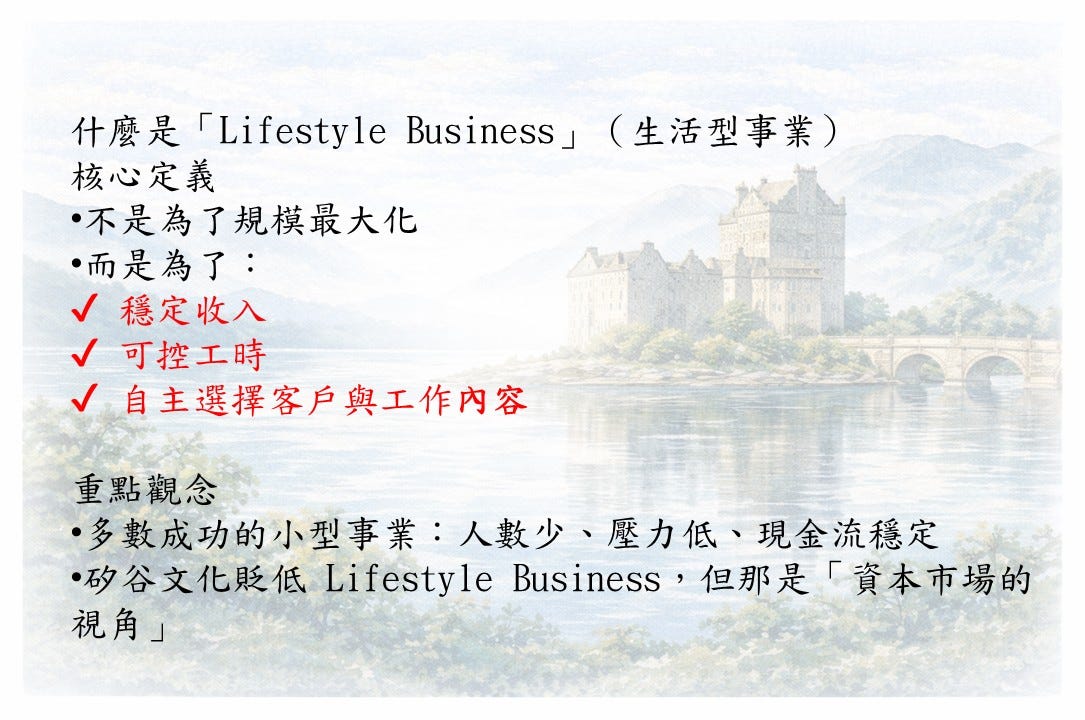 這樣的事業,在傳統創投文化裡常被貶低為「只是 lifestyle business」,但Lifestyle Business 的核心不是「最大化金錢」,而是「最佳化生活」。