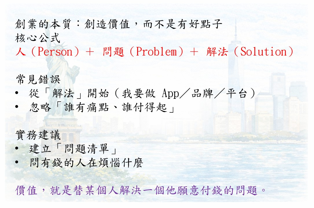 很多人一談創業,第一句話通常是:「我有一個很好的點子。」但現實是,好點子本身,絶對不是創業成功的關鍵。在影片提到創業真正的核心公式,其實非常簡單: