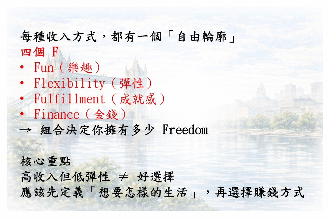 這個例子提醒我們:當某一個 F(通常是 Finance)被過度放大,其他三個面向如果長期失衡,自由感反而會下降。真正成熟理智的選擇,是願意在不同階段,調整自己對樂趣、彈性、成就感與金錢之間的權重。