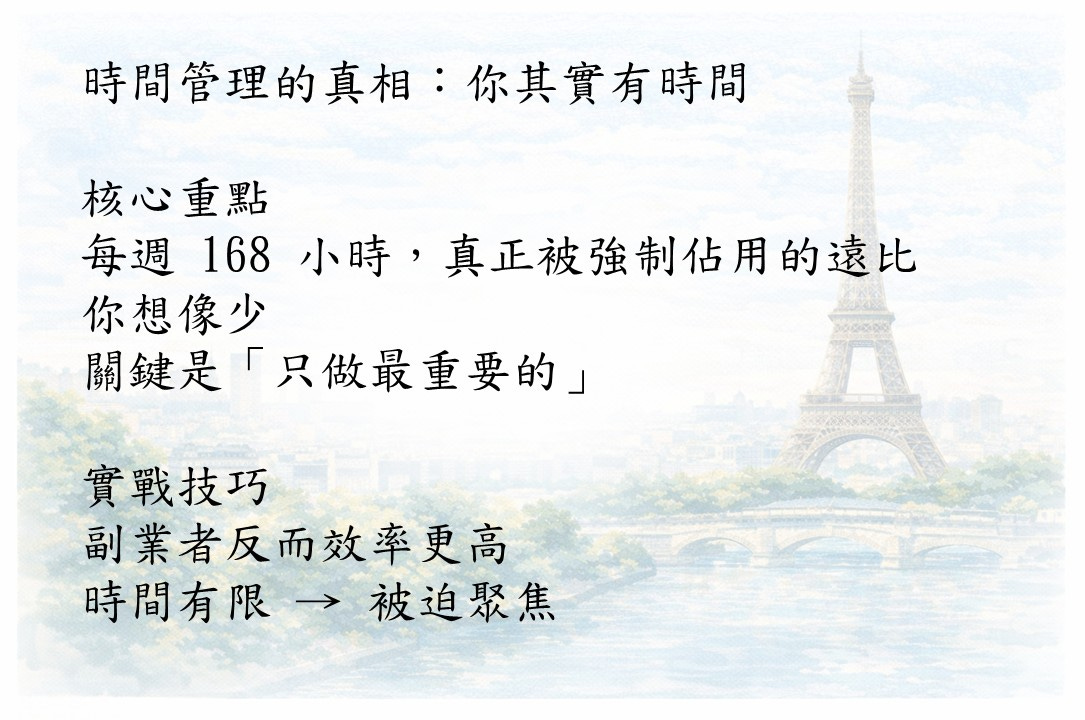 當我們說「我很忙」「我沒有時間」,這句話其實很值得深思。也許這句話代表的是:我們有更重要的優先順序。因為從數學上來看,每個人一週都有 168 小時。真正被「強制佔用」或「排最高等級的順序」的時間,往往比我們想像的少。
