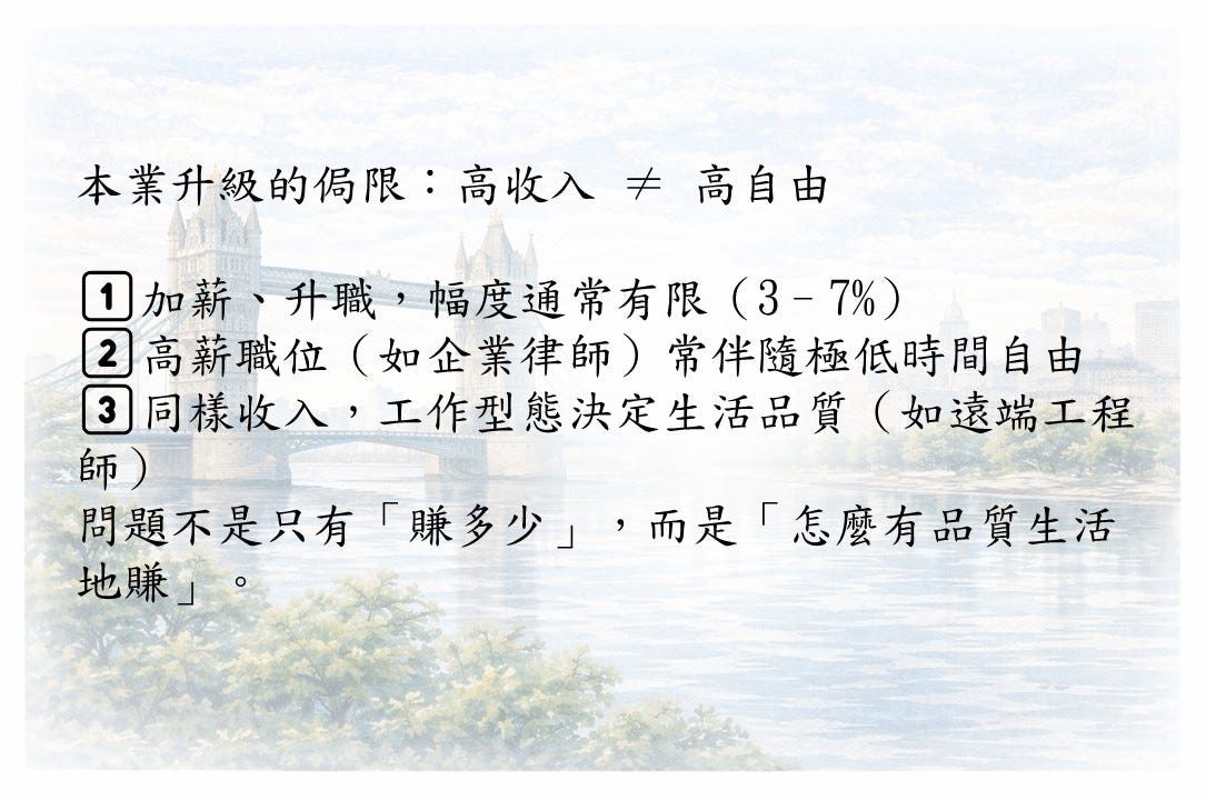 相較之下,同樣年收入水準的遠端工程師、顧問或知識型工作者,因為工作型態不同,往往能保有更高的時間彈性與生活主導權。這也正是為什麼,真正影響生活品質的:不只是收入數字本身,是用什麼方式賺到這筆錢?