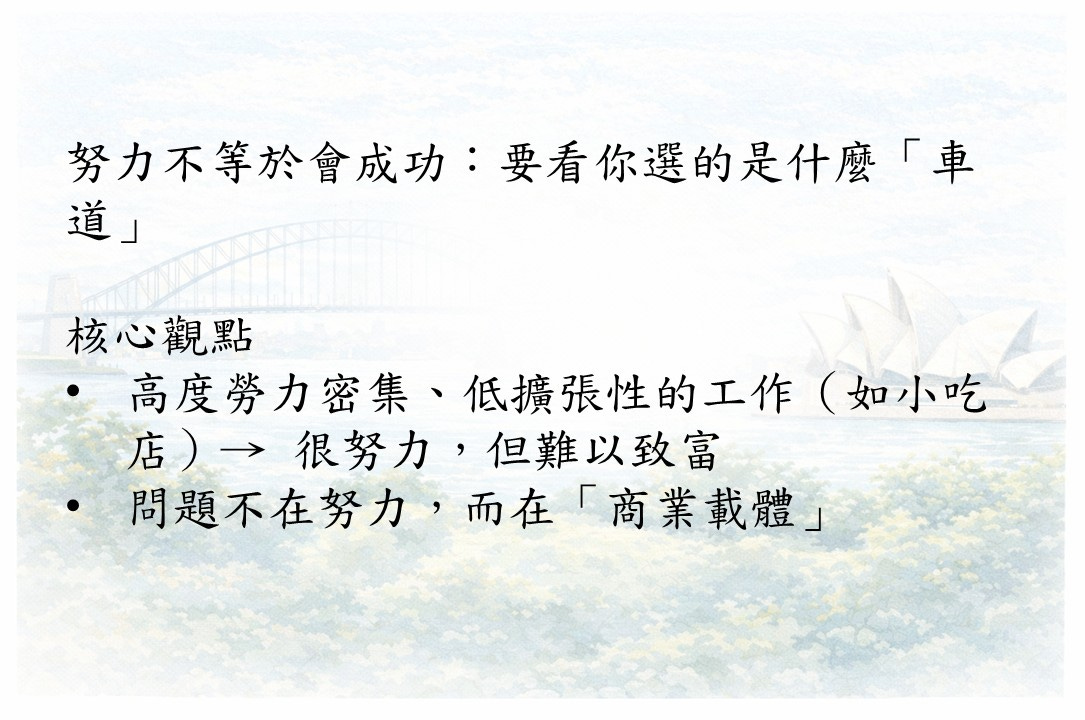 以傳統小吃店為例,開一間滷肉飯小吃店,長時間備料、顧店、清潔,幾乎沒有一天是真的輕鬆。這類型的工作高度勞力密集,收入與工時緊密綁定;即使生意不錯,也很難在不增加人力與時間的情況下,讓收入出現跳躍式成長。這不是經營者不夠用心,而是商業載體本身的擴張性有限。