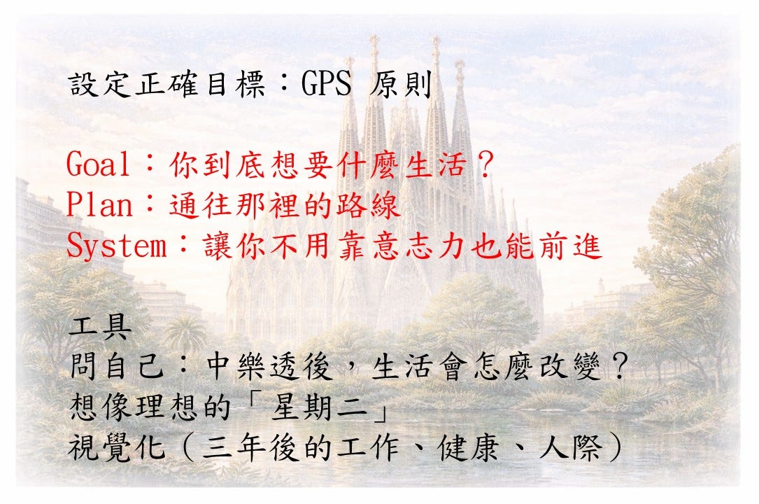 不是職稱,不是收入數字,而是——你希望每天醒來,過的是什麼樣的一天?如果三年後的某個星期二,你回頭看現在的自己,你希望看到的是什麼樣的改變?