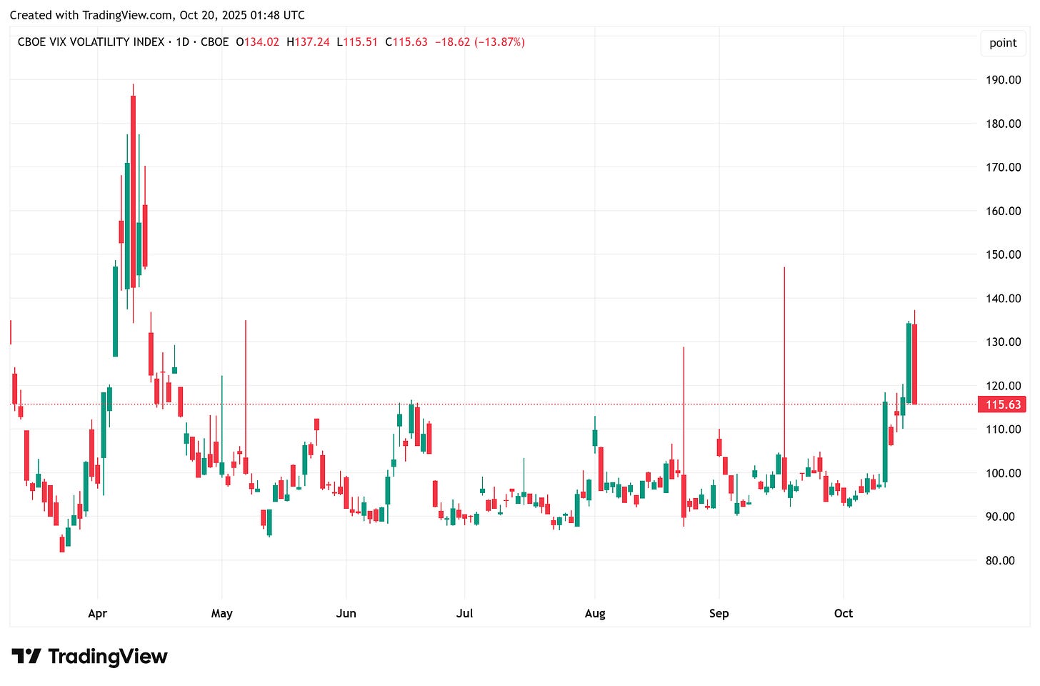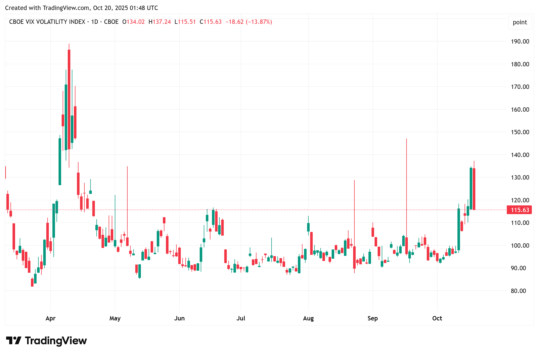 VIX 約在 20 上下,較長期平均略高。10 月中一度觸及 25。這顯示市場波動預期已明顯上升,但尚未進入全面恐慌。