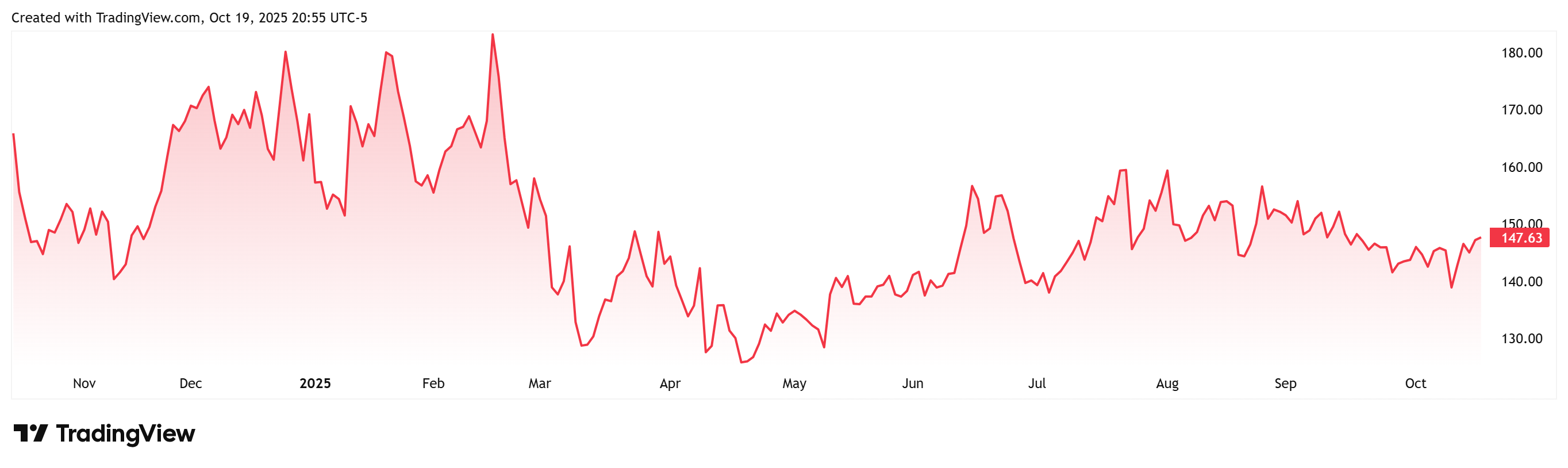 SKEW 約 147.6,屬於偏高水準,意味市場對極端下跌的關注度顯著提升。