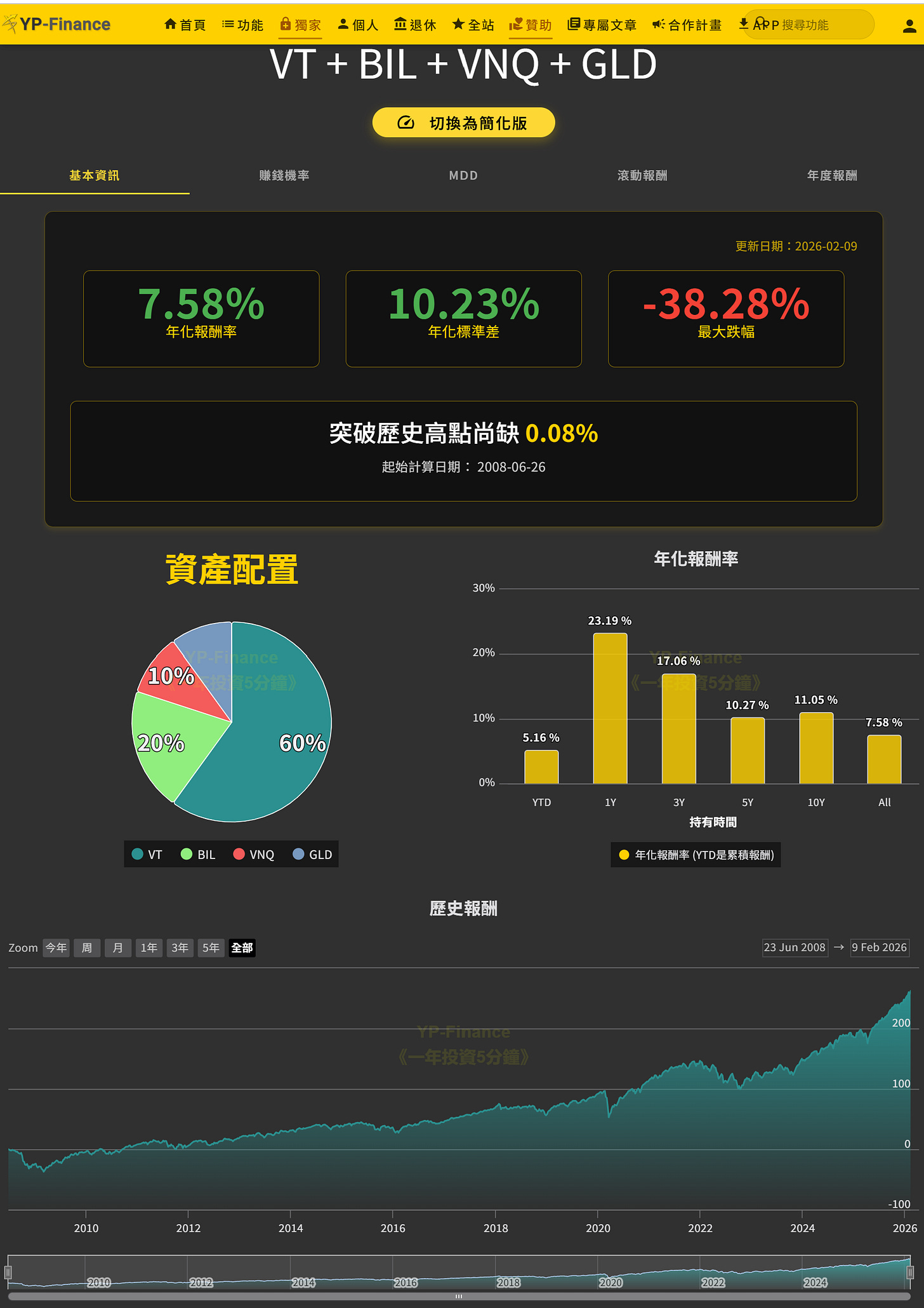 從結果來看,這個組合的年化報酬約 7.6%,波動(年化標準差)約 10%,最大回撤落在 −38%。它不是追求「每一年打敗大盤」,而是在長時間軸下,讓投資人撐得過景氣循環、股災與政策轉折。