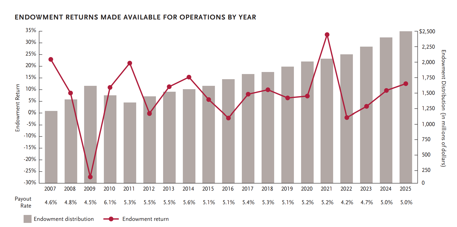 相反地,圖中紅線所代表的校務基金年度投資報酬,呈現出與股票市場同樣劇烈、甚至更為放大的波動性:2009 年接近 -27%,2021 年超過 +30%。但與此同時,灰色柱狀所顯示的實際可用於校務運作的 distribution,卻是一條幾乎單向、平滑向上的軌跡。