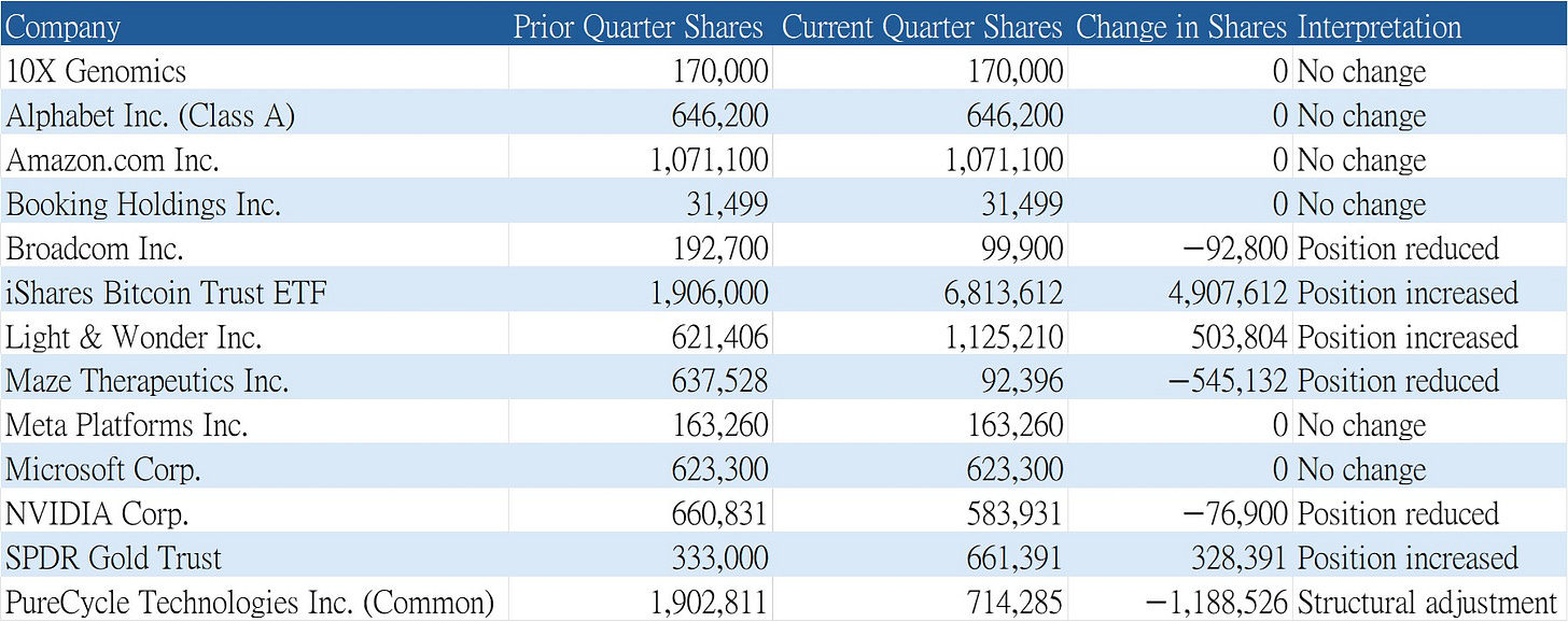 另一方面,Maze Therapeutics 與 PureCycle Technologies 的股數大幅下降,則更接近「結構性調整」。特別是 PureCycle,由普通股轉為其他形式持有,已不適合再用單純的增減碼邏輯解讀,而是反映投資工具或持有架構的改變。這類變化,與市場情緒關聯度反而不高,更像是內部投資架構的整理。