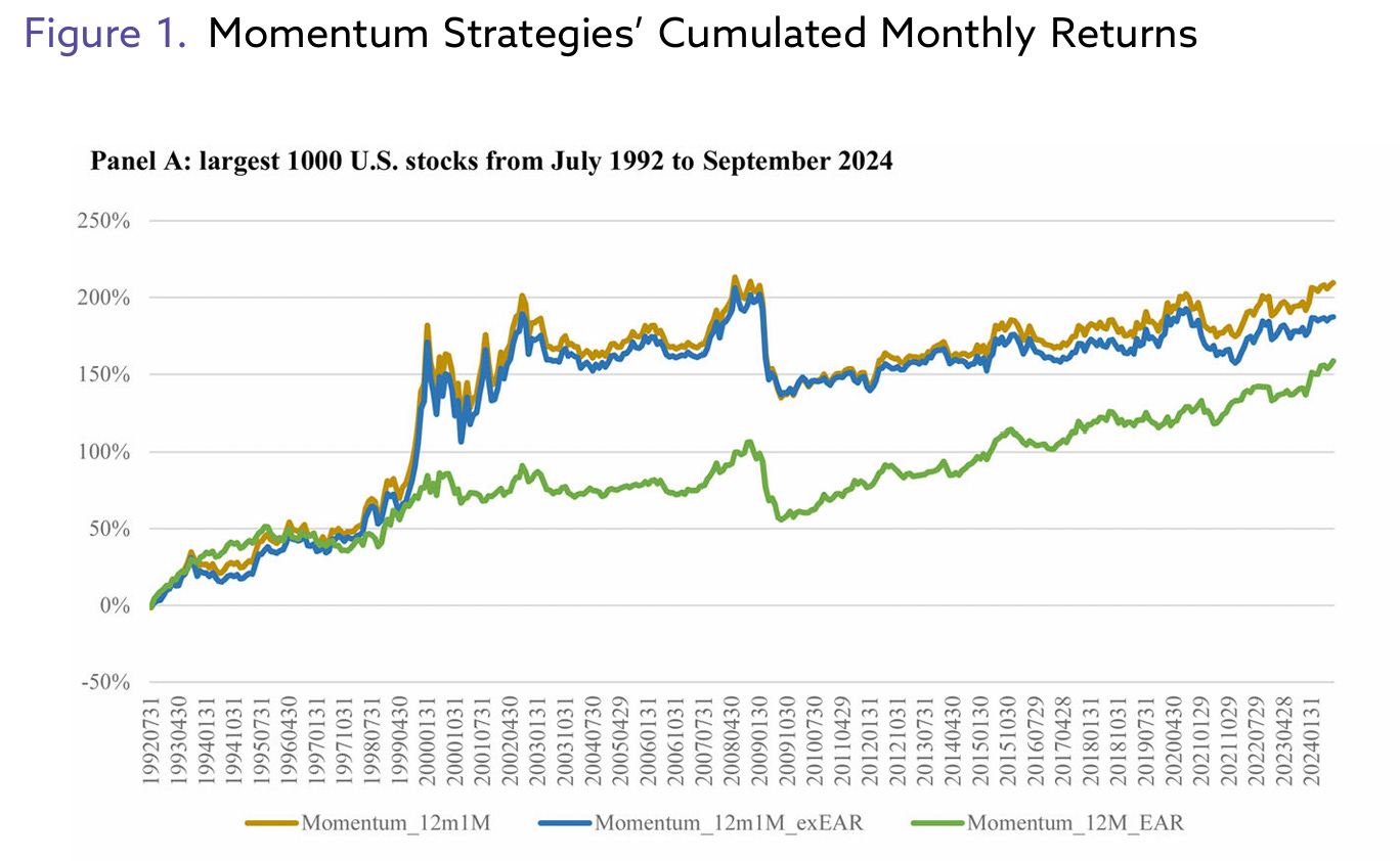 這張圖呈現的是三種動能策略在美國大型股市場的長期累積報酬走勢,用來直觀比較「傳統動能」、「排除盈餘公告的動能」,以及「只由盈餘公告構成的動能」之間的差異。橫軸為時間(1992 年至 2024 年),縱軸為累積報酬。圖中的 Momentum_12m1M 代表標準的 12–1 股票傳動動能策略,即使用過去 12 個月、跳過最近一個月的日報酬;Momentum_12m1M_exEAR 則進一步排除了所有盈餘公告日前後 ±2 天的報酬;而 Momentum_12M_EAR 僅保留過去一年所有盈餘公告期間的報酬,是最純粹的「公告型動能」。