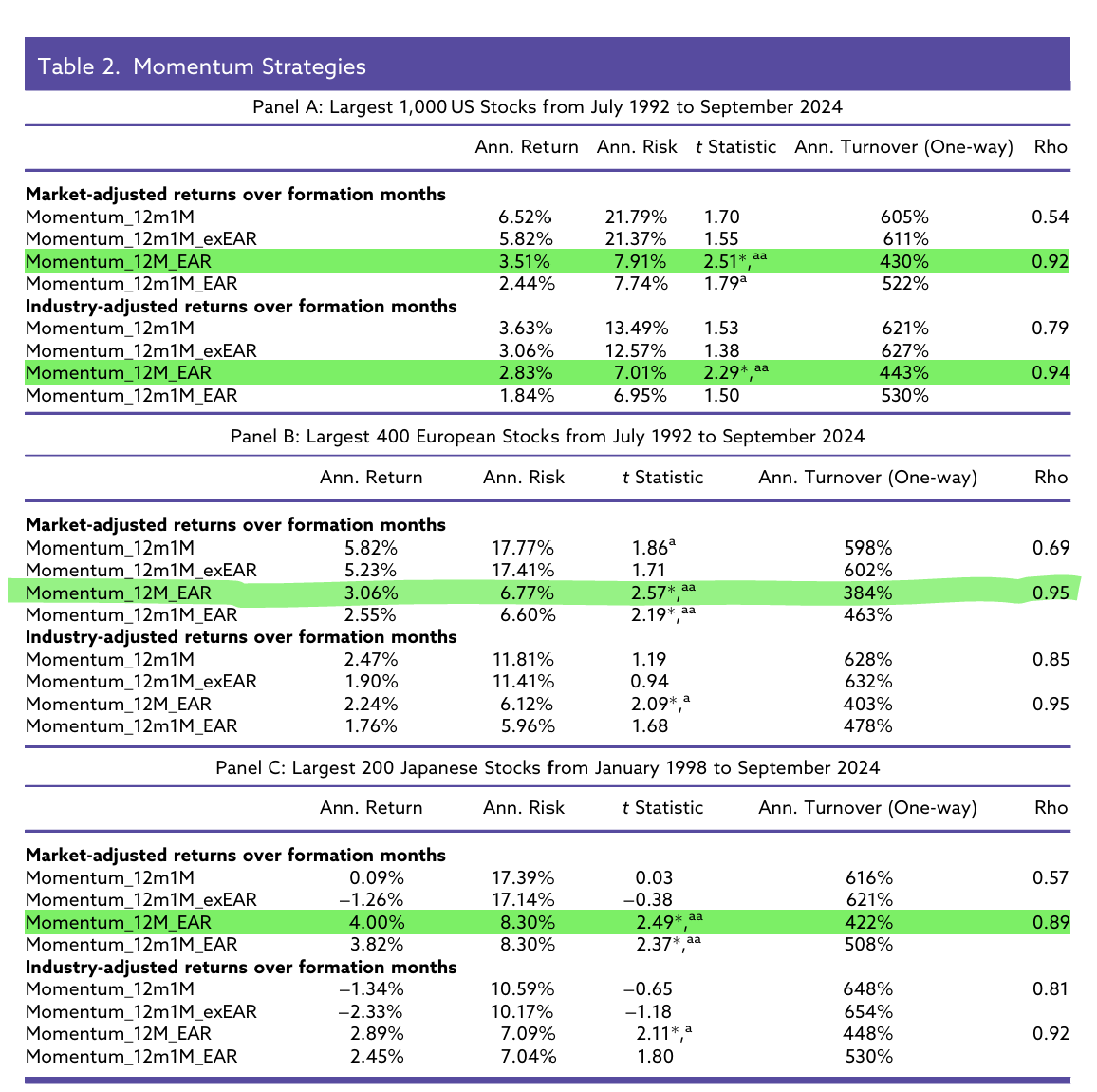 表2無疑是整個論文的main table 彙整了三個主要已開發市場中,不同動能策略的長期表現,目的在於比較傳統股票動能與以盈餘公告為基礎的動能策略在報酬結構與風險特性上的差異。Panel A 為美國最大 1,000 檔股票(1992–2024),Panel B 為歐洲最大 400 檔股票(1992–2024),Panel C 則為日本最大 200 檔股票(1998–2024)。每個市場同時呈現以市場調整與產業調整後的動能績效,並比較年化報酬、年化風險、t 值、單邊年化換手率,以及多空部位之間的相關係數(Rho)。