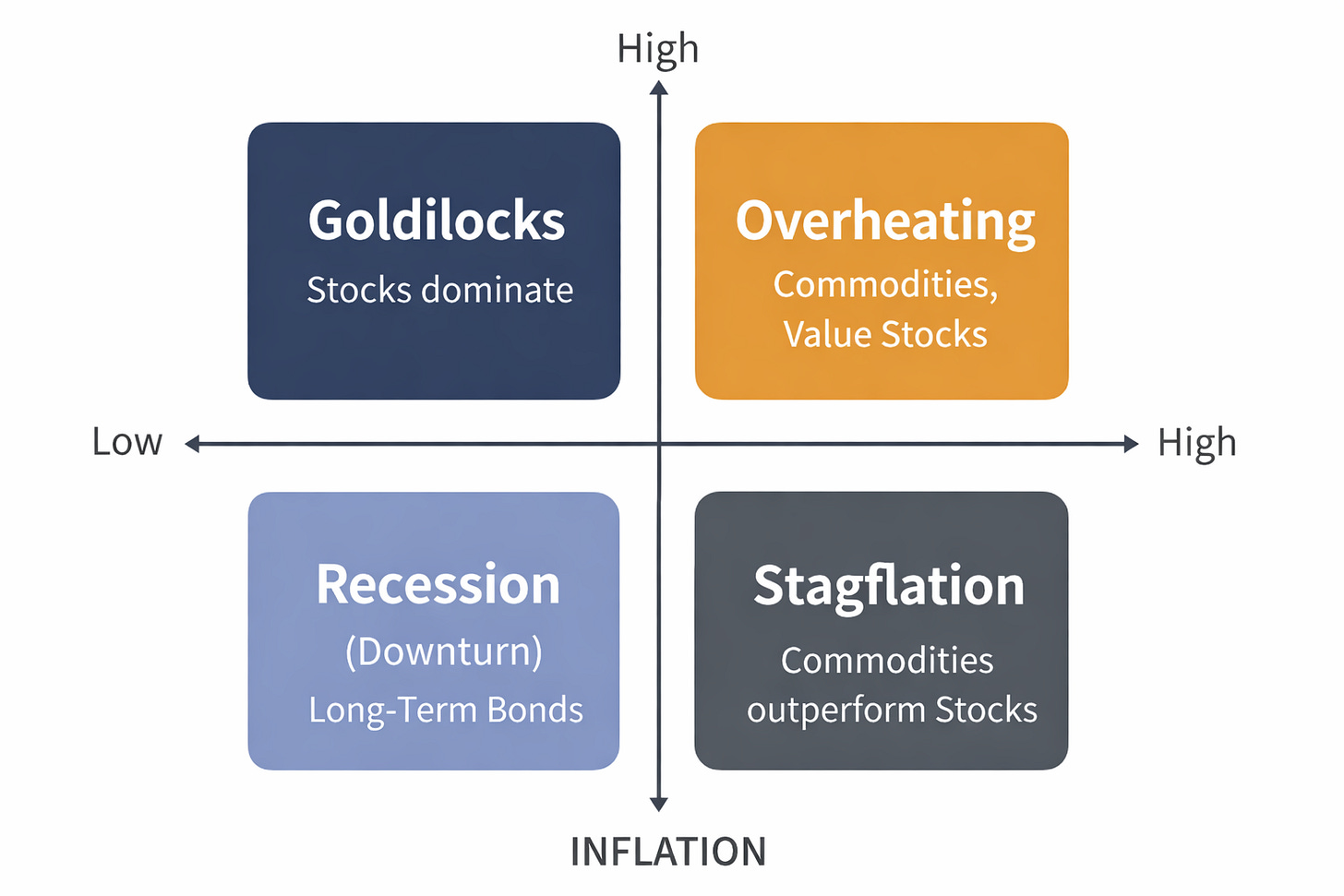 最具挑戰性的環境。成長疲弱但通膨仍高,傳統股債配置容易同時承壓。TIPS、黃金與部分商品提供相對保護。Recession / Downturn(低成長、低通膨)