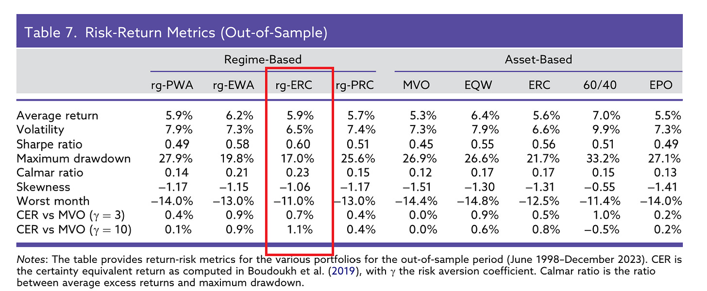 表 7 比較的是樣本外期間(1998–2023)不同策略的風險報酬表現。結果顯示,在 Regime-Based 方法中,rg-ERC 的 Sharpe ratio 最高(0.60),波動最低(6.5%),最大回檔也最小(17.0%),整體風險調整後表現最穩健。相較之下,傳統 60/40 雖然平均報酬最高(7.0%),但波動與最大回檔也最大(33.2%)。此外,在風險趨避係數較高的情境下(γ=10),rg-ERC 的確定等值報酬(CER)優勢更加明顯,顯示其在長期資金管理下具更佳穩健性。