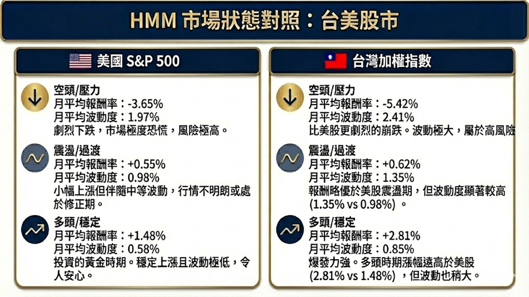 去年在替某機構做教育訓練時,我曾用 HMM 模型將台美股市劃分為空頭、震盪與多頭三種市場狀態。結果顯示,不同狀態下的報酬與波動差異非常明顯,而且台美市場的狀態分布比例也不同。