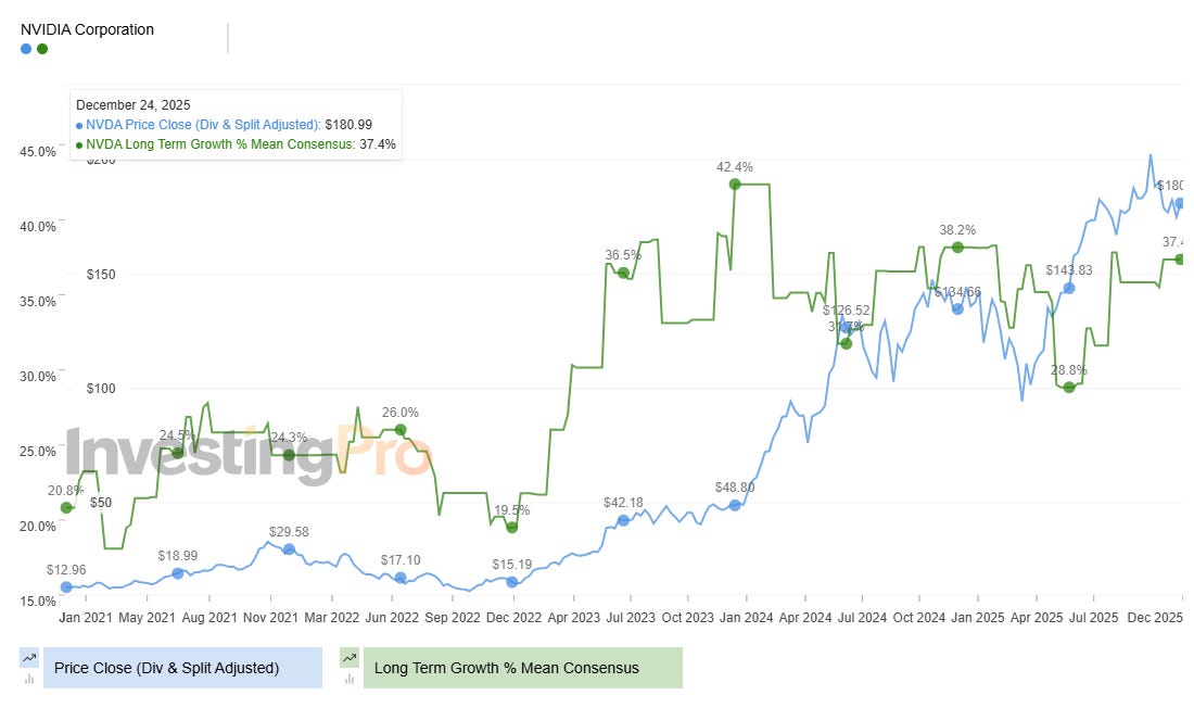 這個指標呈現的是分析師對公司長期成長率的平均預期。疊加在原本的價格上,我們