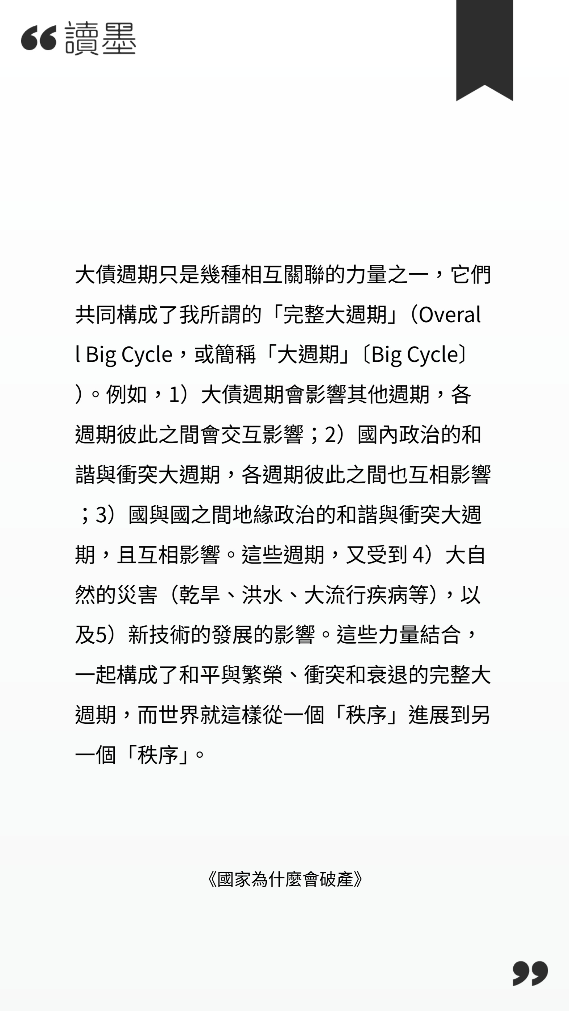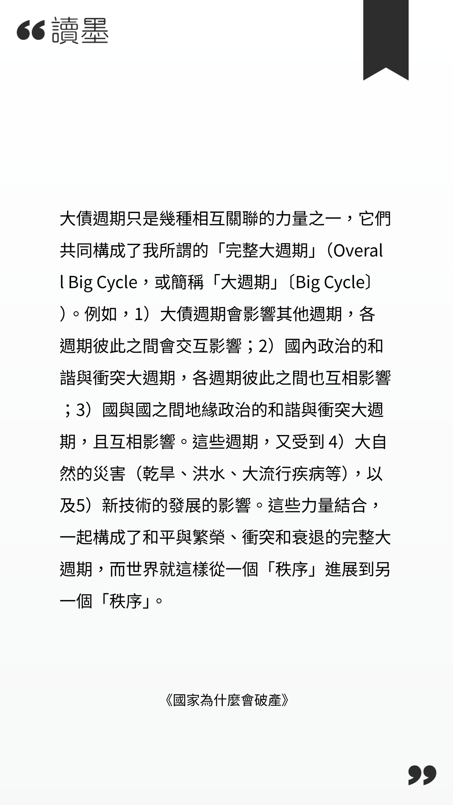 回顧他的寫作脈絡,可以清楚看到一條逐步放大的思考軸線。早期的《Principles》,談的是個人與組織如何在不確定環境中建立決策原則;《The Changing World Order》則把視角拉到歷史層級,分析霸權如何在數百年間興衰更替;而《國家為什麼會破產?》,則進一步聚焦在「貨幣制度如何在長期失衡下被迫重整」。