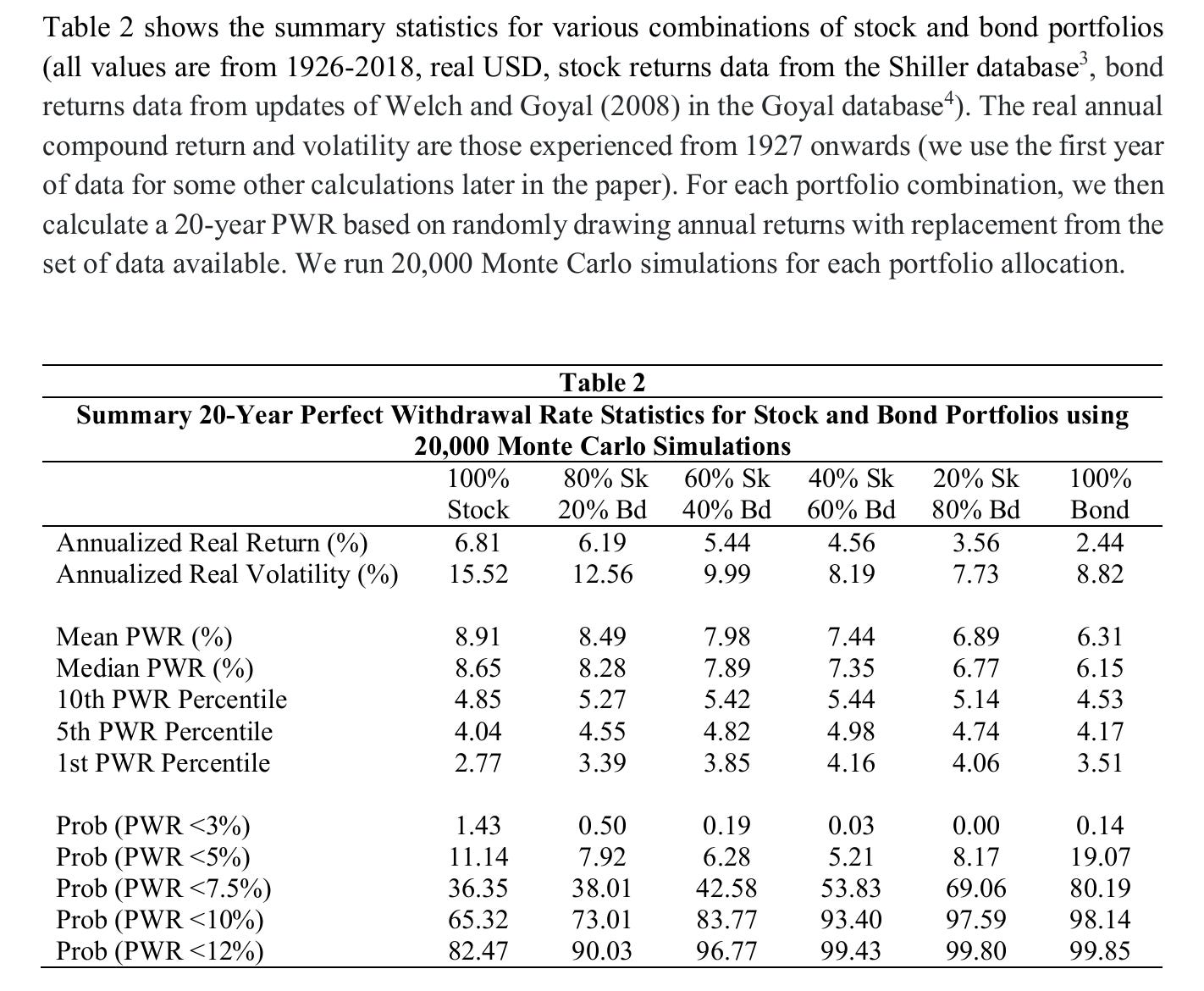 Table 2 彙整了不同股債配置,在退休提領情境下的整體表現。作者使用 1926–2018 年的美國實質報酬資料,針對每一種股債比例,進行 20,000 次蒙地卡羅模擬,每一次模擬都隨機抽取一組 20 年的年度報酬順序,並計算該報酬順序下所對應的 20 年 Perfect Withdrawal Rate(PWR)。因此,這張表不是在描述「平均報酬表現」,而是在回答一個更貼近退休實務的問題:在不同市場路徑下,這種資產配置能承受的提領率分布長什麼樣子?