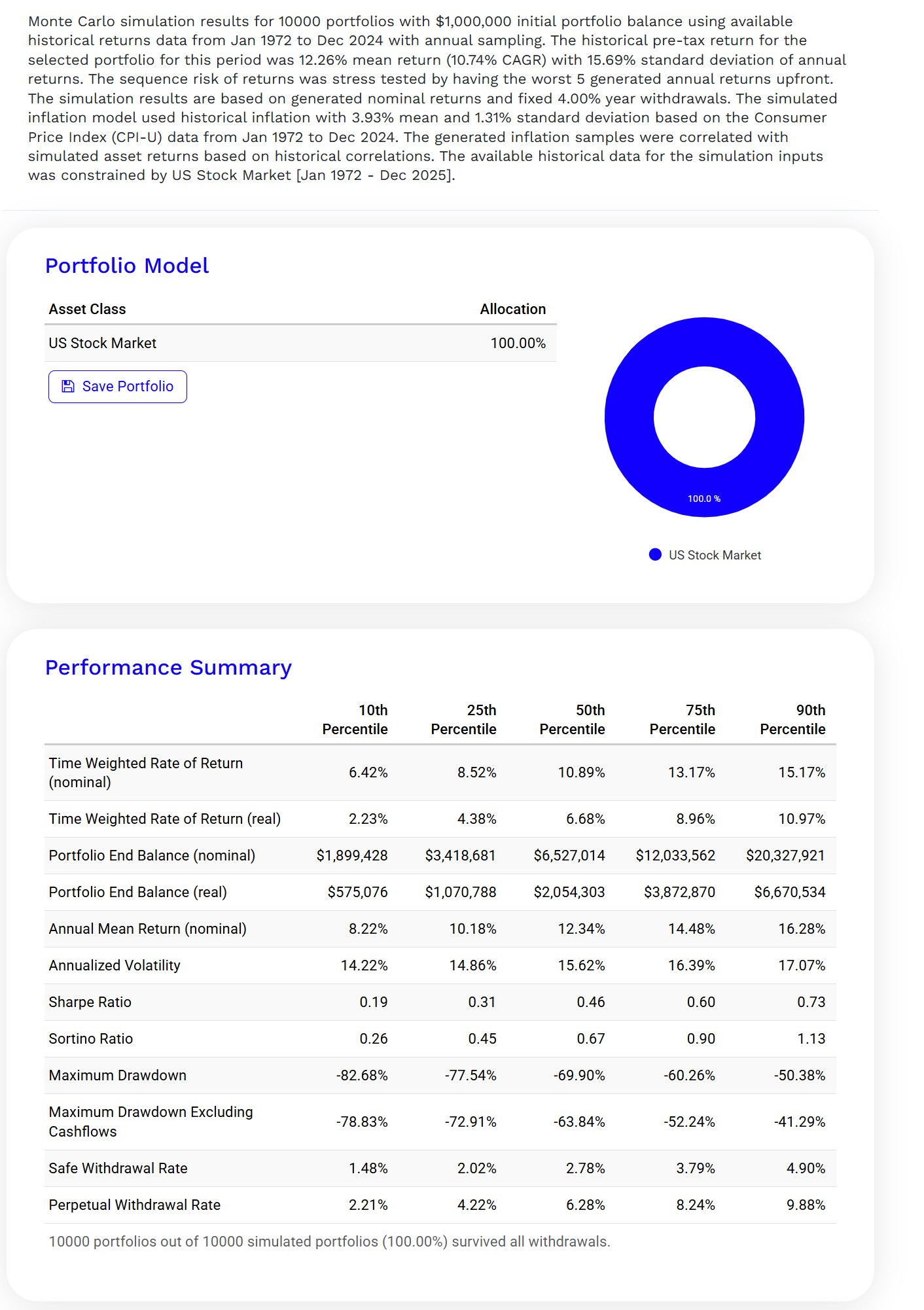 在 100% 股票配置下,即使在 10th percentile 的情境中,最大回撤仍高達 約 −83%(含提領),即便排除提領現金流,市場本身的回撤也接近 −79%。這代表在退休初期,投資人必須承受極端劇烈的資產縮水,同時仍持續出售股票來支付生活費。