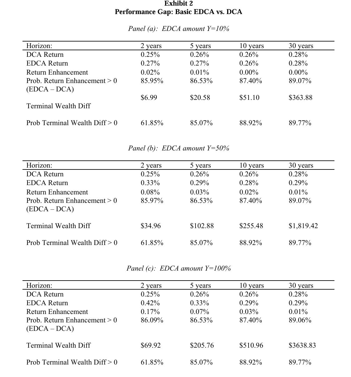 相較於年化報酬,Exhibit 2 中更具經濟意義的指標為「Terminal Wealth Diff(最終財富差距)」。