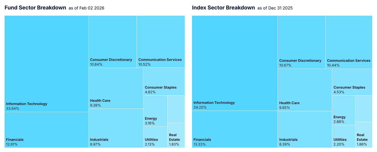 SHE ETF 的產業佈局與傳統指數(SPX)極為相似;這意味著 績效差異並非來自產業輪動,而是公司選股差異