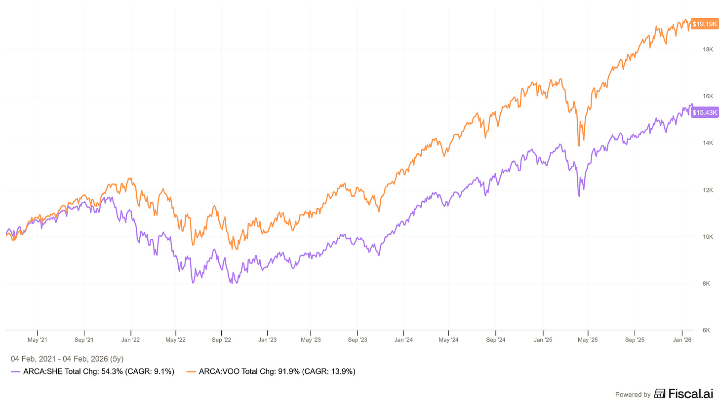 具體而言,在五年觀察期間內,SHE ETF 的總報酬約為 54.3%,對應的年化報酬率(CAGR)約為 9.1%;相較之下,VOO 的總報酬約為 91.9%,年化報酬率約為 13.9%。此一結果顯示,在該期間內,性別治理導向的投資策略並未在總報酬層面超越市值加權的市場投資組合。