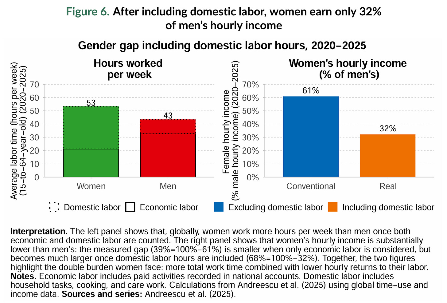 一旦將家務與照護勞動納入,女性的實質時薪僅為男性的 32%。
