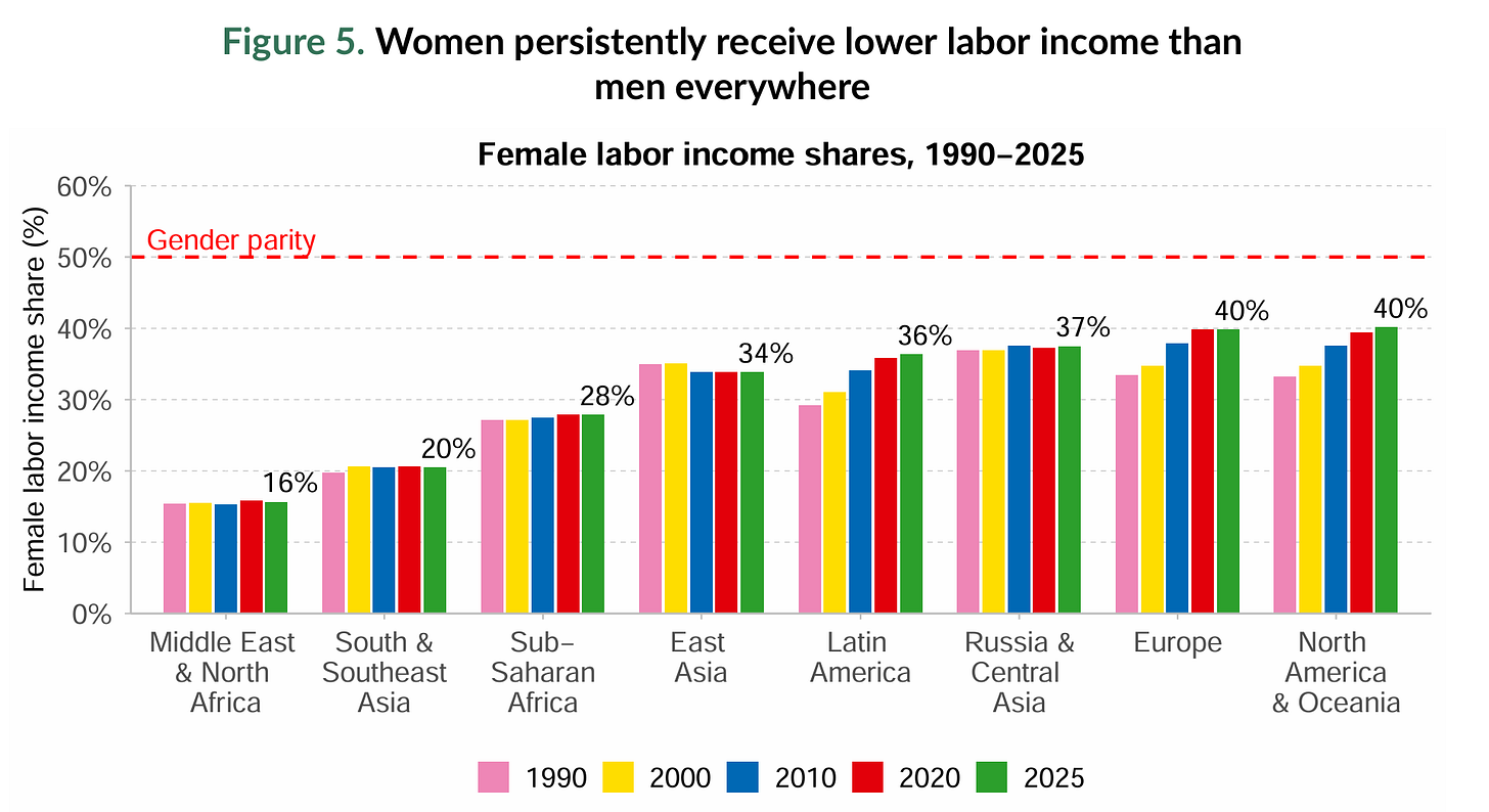 根據《World Inequality Report 2026》,即使在高所得地區,女性在整體勞動收入中的占比,至今仍遠未達到性別平權的水準。