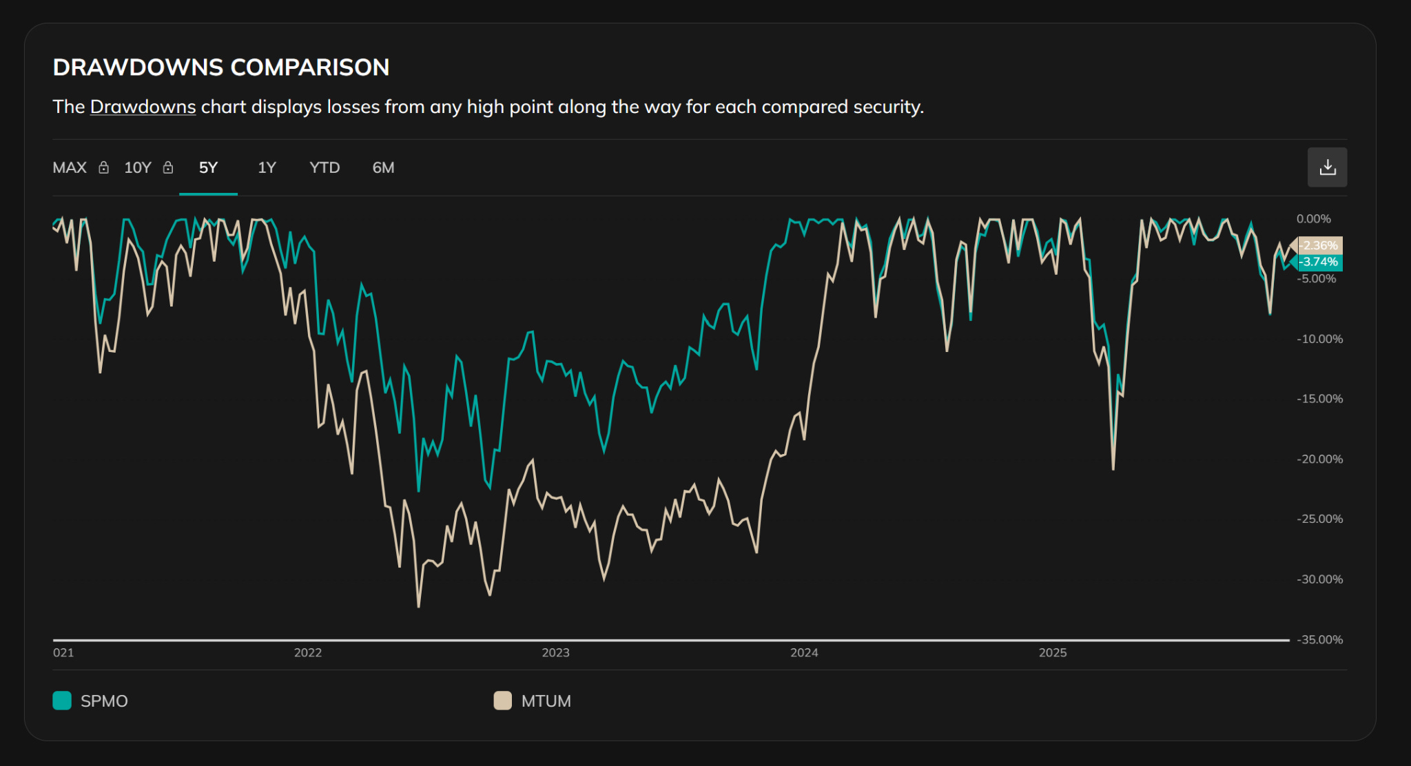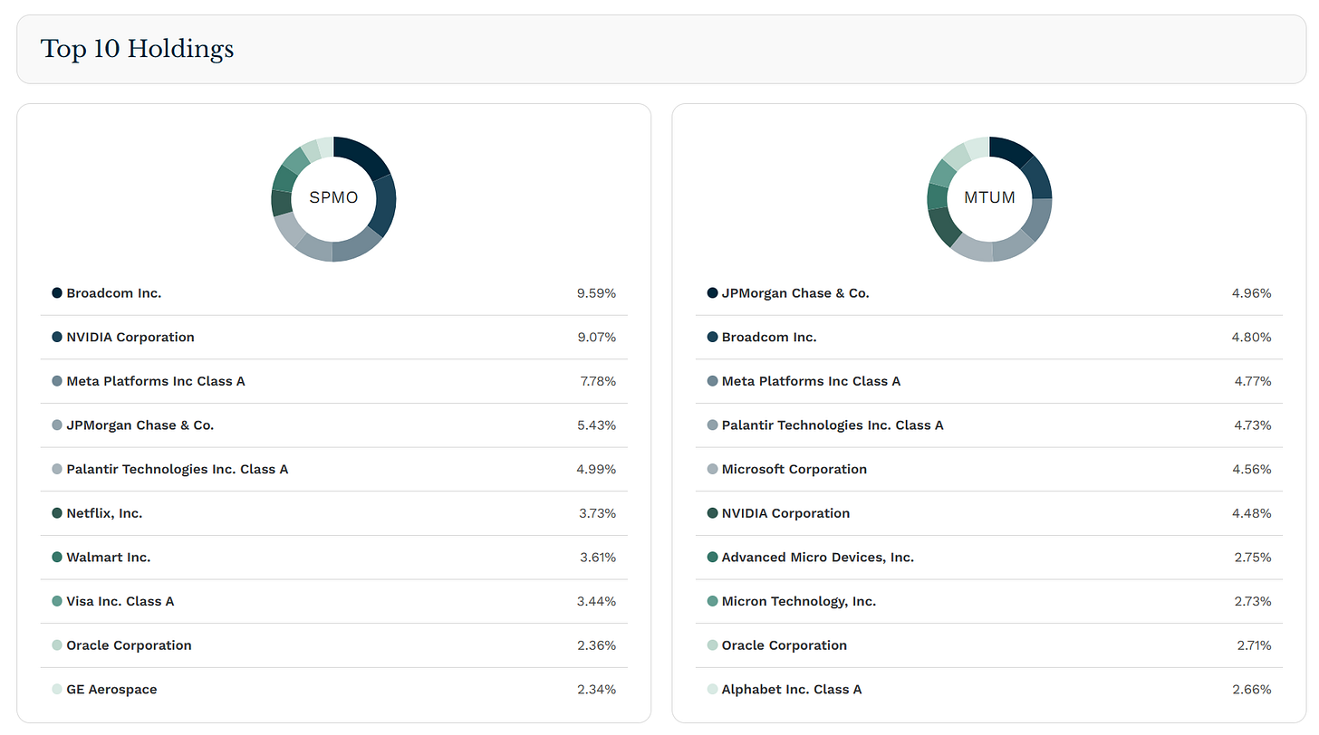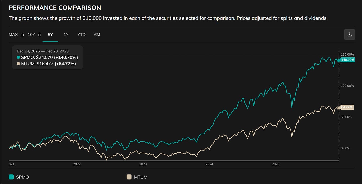 但圖表顯示:MTUM 在 2022 年有更深、修復更慢的回撤,而SPMO 的回撤 雖然快,但修復速度更快;然而近期回撤幅度兩者其實相近。這說明:集中動能不是問題,