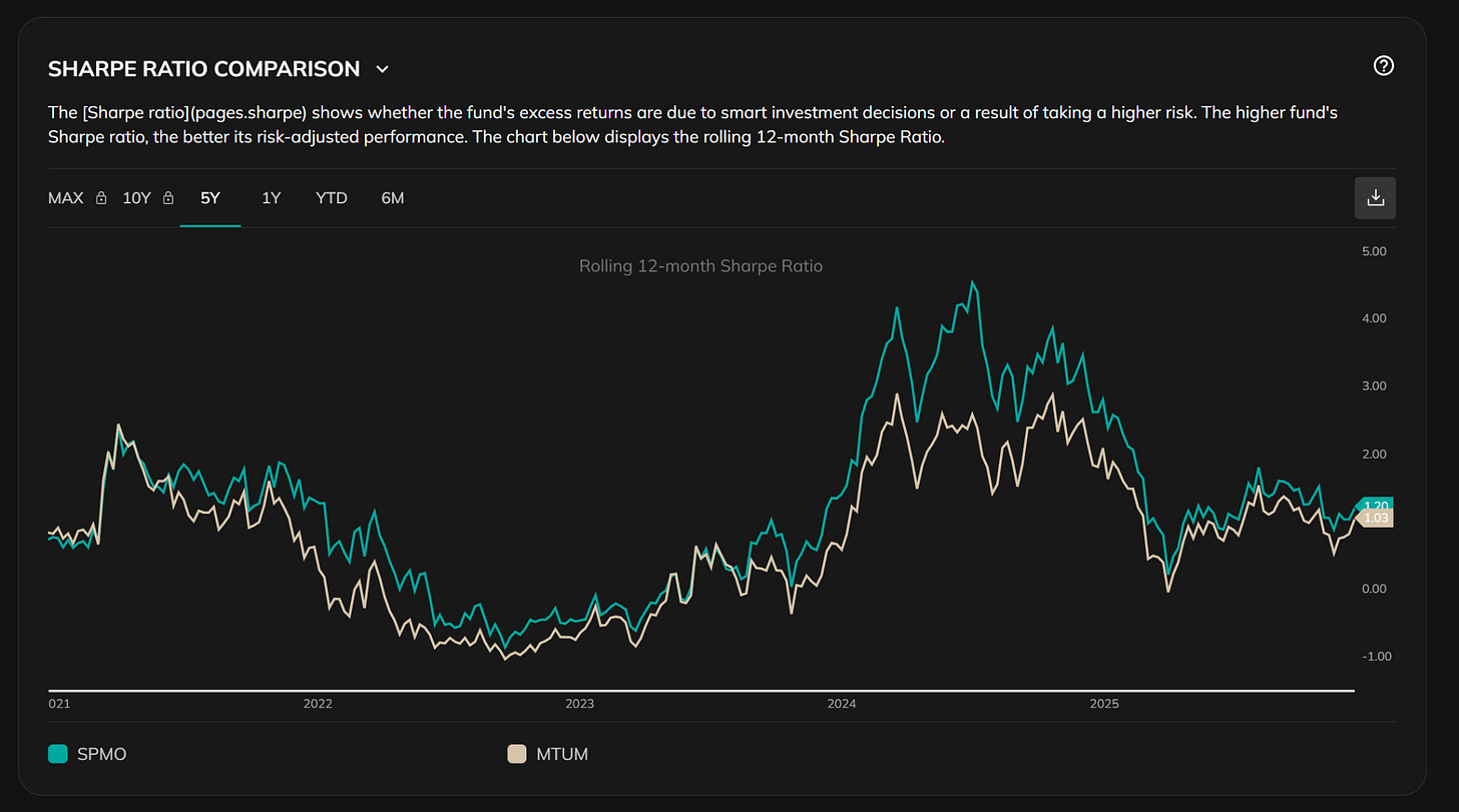 從 rolling 12-month Sharpe ratio 來看:多數時間 SPMO 高於 MTUM,在上行期間差距尤其明顯,而回落期兩者同步下降,但 SPMO 沒有系統性劣化。這代表一件很重要的事:SPMO 的超額報酬,並非單純靠承擔更多波動換來。而是在同樣承擔市場風險的情況下,資金配置效率更高。在後續的因子分析,也會得到同樣的結論。