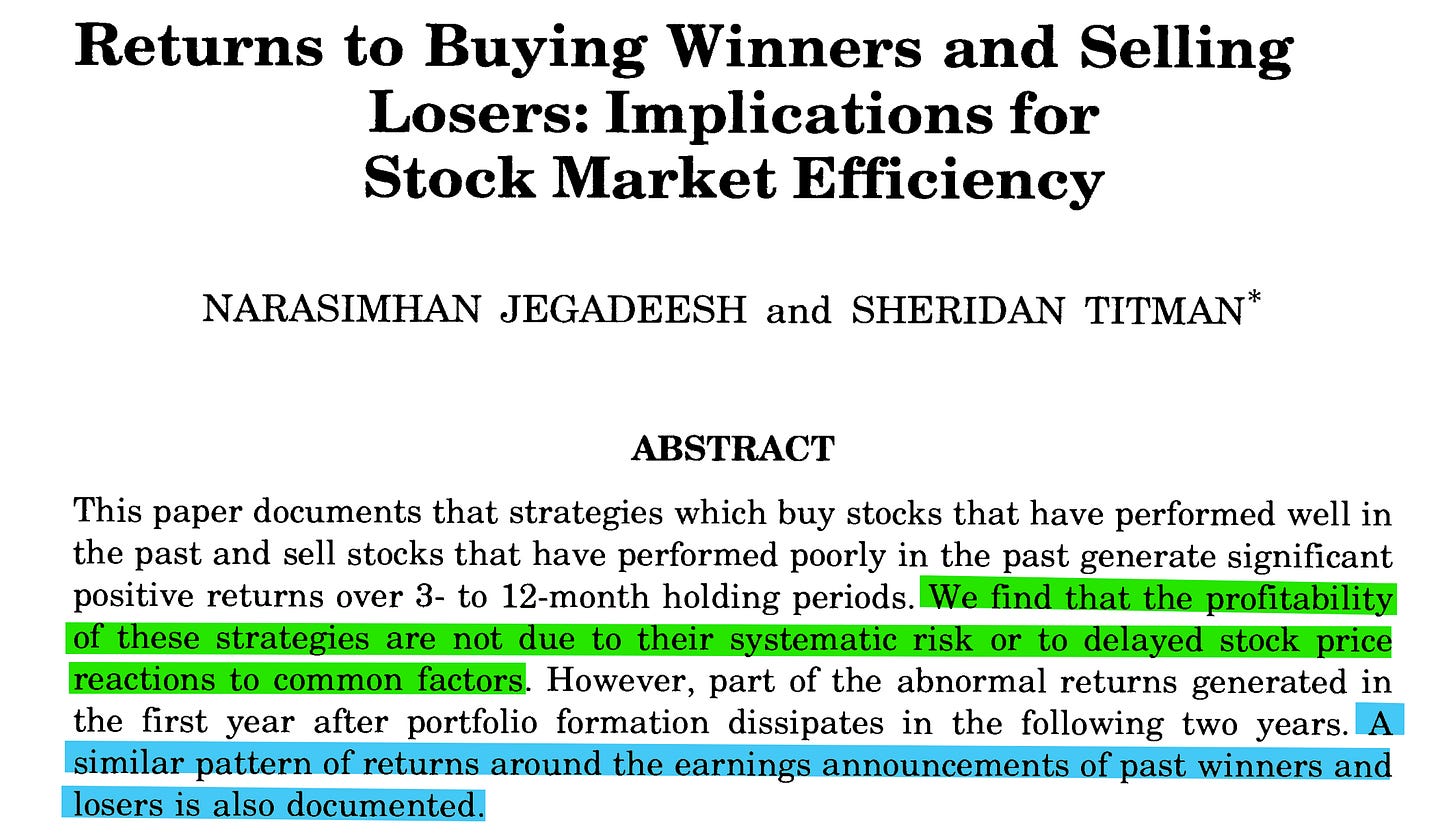 Jegadeesh, N., & Titman, S. (1993). Returns to buying winners and selling losers: Implications for stock market efficiency. The Journal of finance, 48(1), 65-91.