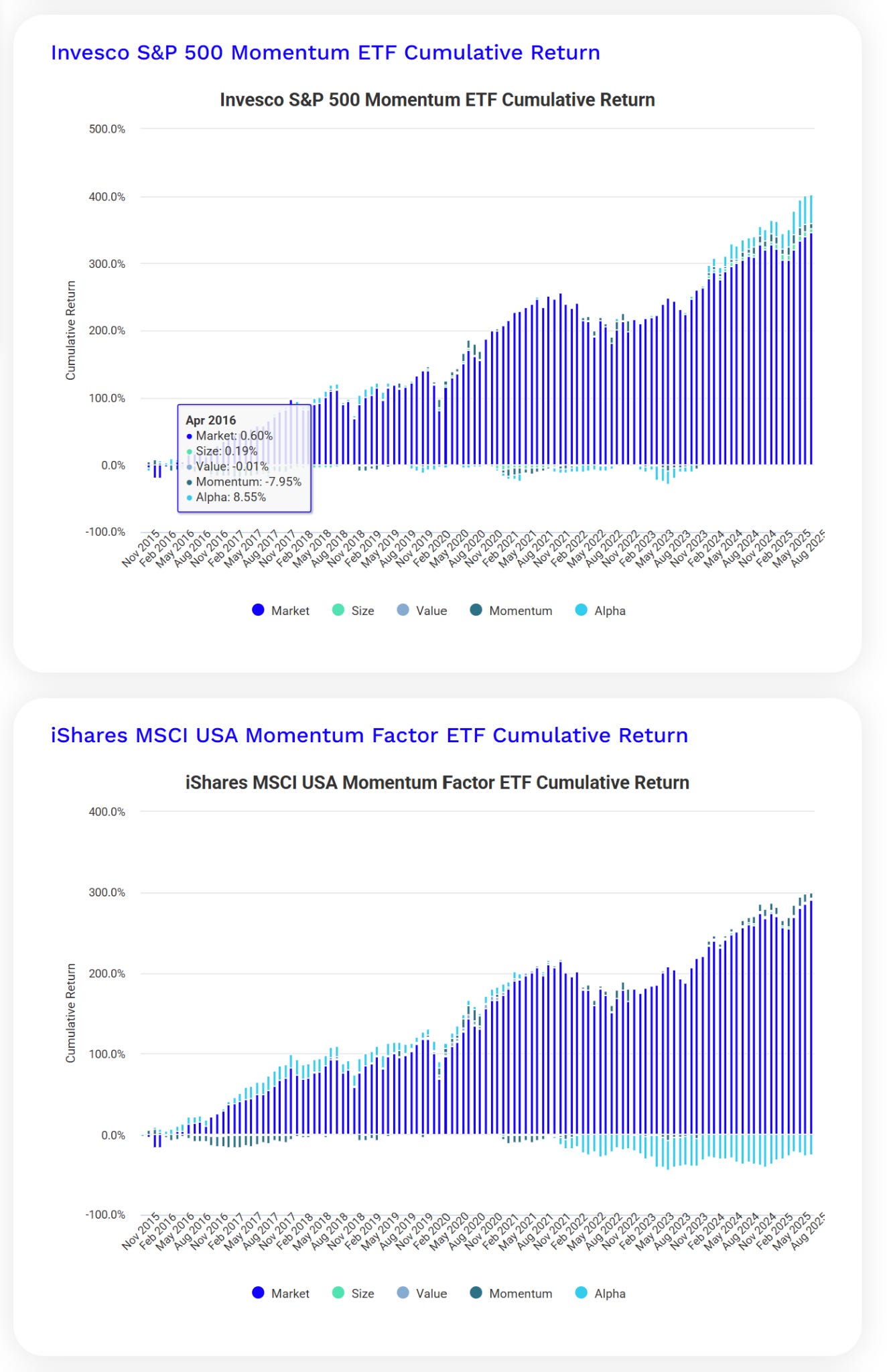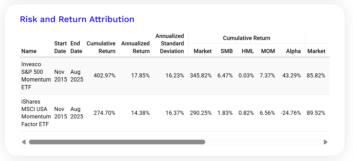 但真正關鍵的是「報酬來源」:兩檔 ETF 都有很高的 市場曝險(Market),其中Size、Value 因子貢獻都很小,真正拉開差距的是—Alpha(非因子解釋的超額報酬):SPMO 的 Alpha 是顯著正值;而MTUM 的 Alpha 則是顯著負值。這樣的數字代表:SPMO 不只是「搭到牛市」,而是在既有因子之外,做對了資金配置選擇。