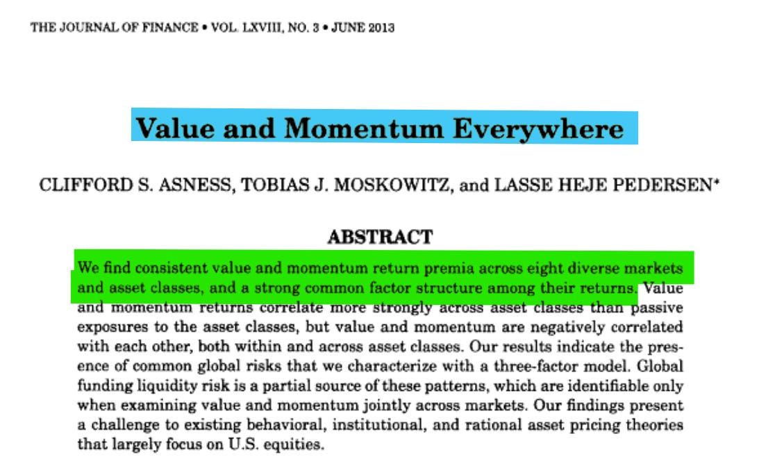 Asness, C. S., Moskowitz, T. J., & Pedersen, L. H. (2013). Value and momentum everywhere. Journal of Finance, 68(3), 929–985.