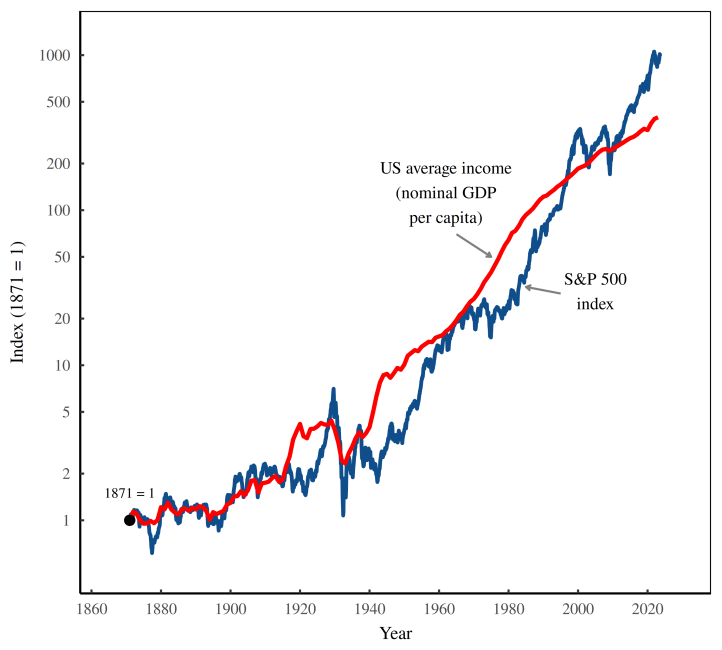 與反方不同,正方並不否認股市與 GDP 之間存在偏離。相反地,Blair Fix 的長期資料顯示,這種偏離本身正是理解市場的重要線索。在百年以上的尺度中,股市報酬與 GDP per capita 的成長速度大致相當,但在較短的時間區間內,兩者會呈現明顯的領先與落後循環。