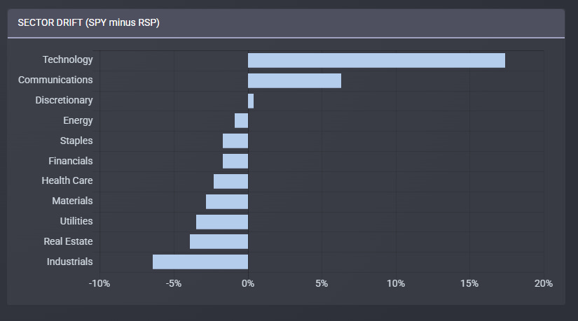 而下面這張圖則顯示 SPY 相對於 RSP 的產業權重差異(SPY − RSP)。可以看到 SPY 在 Technology 的權重明顯高出約 17%,顯示市值加權指數高度集中於大型科技公司。相反地,RSP 在 Industrials、Real Estate、Utilities 等傳統產業的權重更高,因為等權重配置會提升中型企業的影響力。換句話說,SPY 更代表 mega-cap 主導的市場結構,而 RSP 則更接近 廣泛分散的整體企業市場。