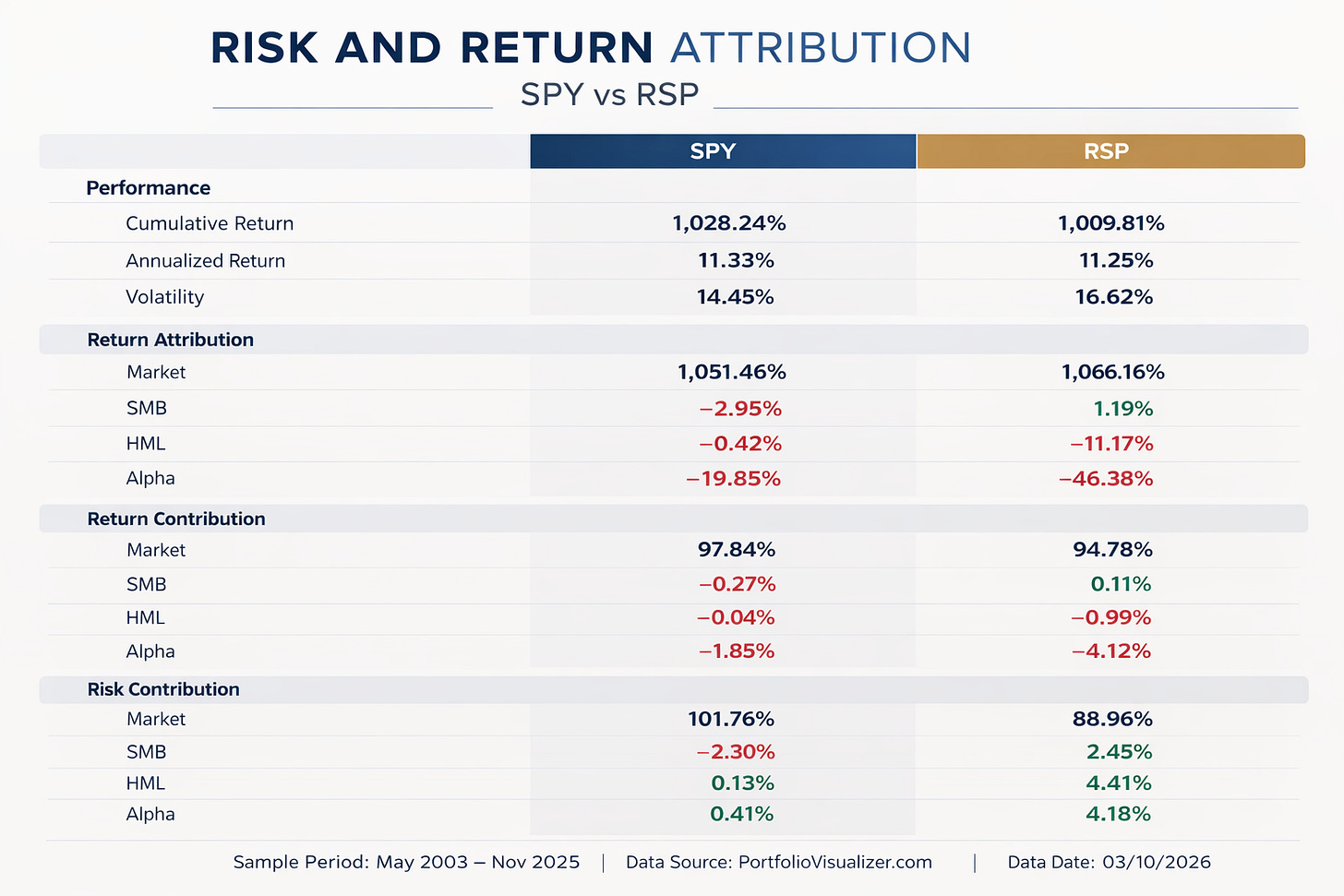 相較之下,RSP 由於採 等權重配置,在 規模因子(SMB)與價值因子(HML) 上的暴露更高,因此風險與回報來源更加多元。