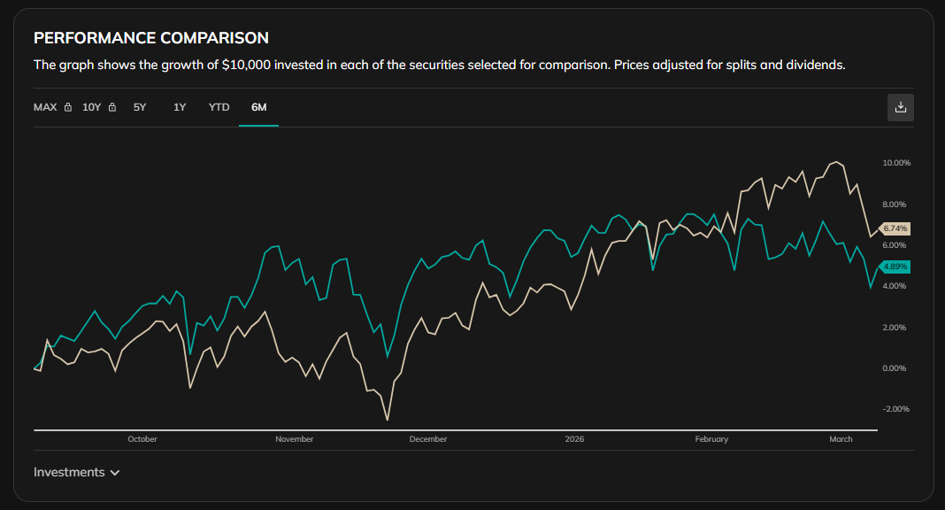 但從下圖近期六個月的市場走勢來看,SPY 與 RSP 的表現差異其實非常具有代表性。