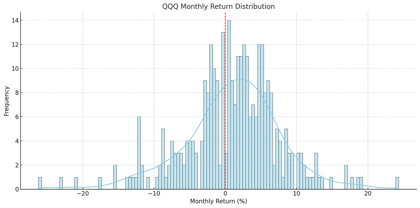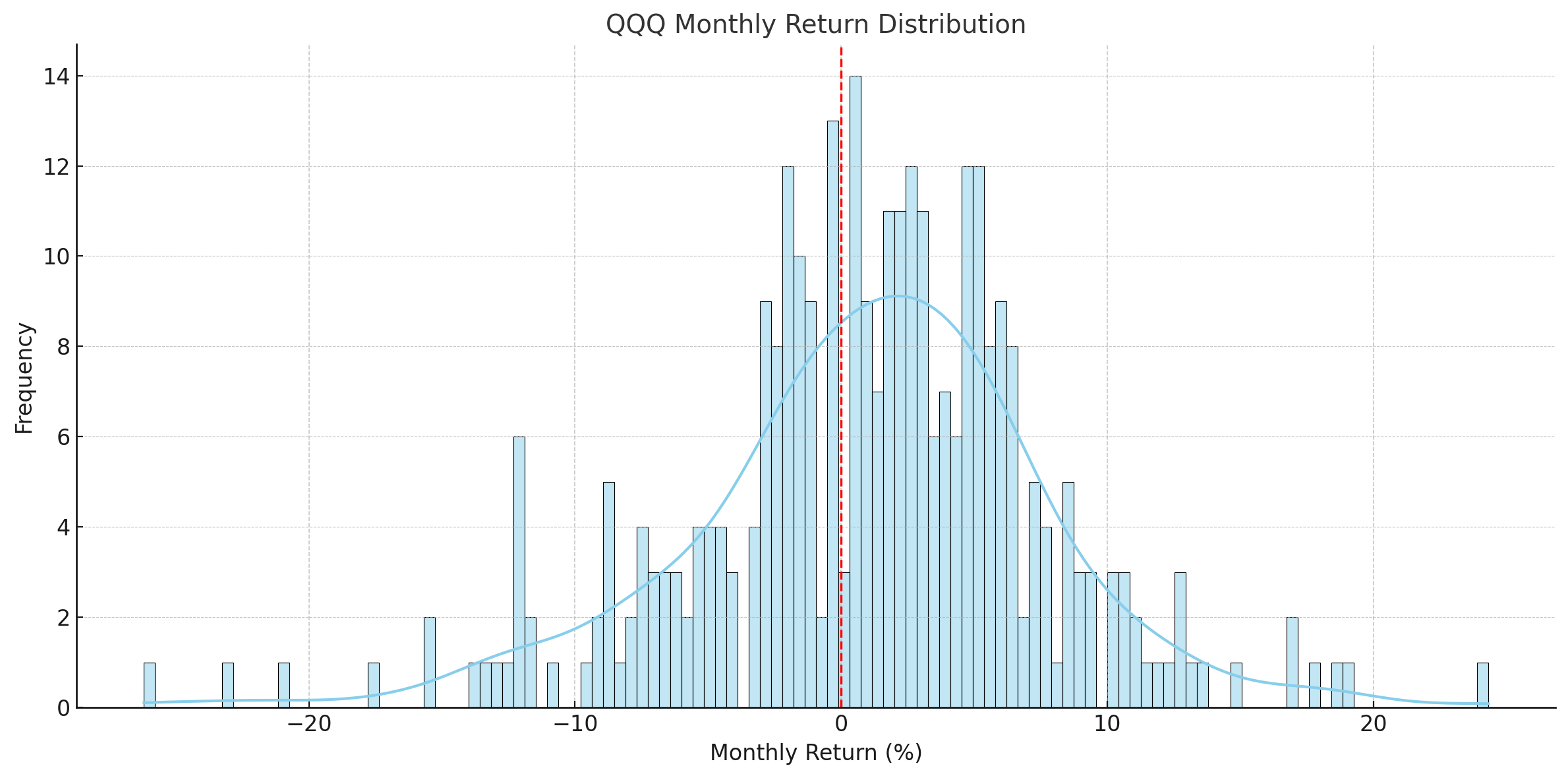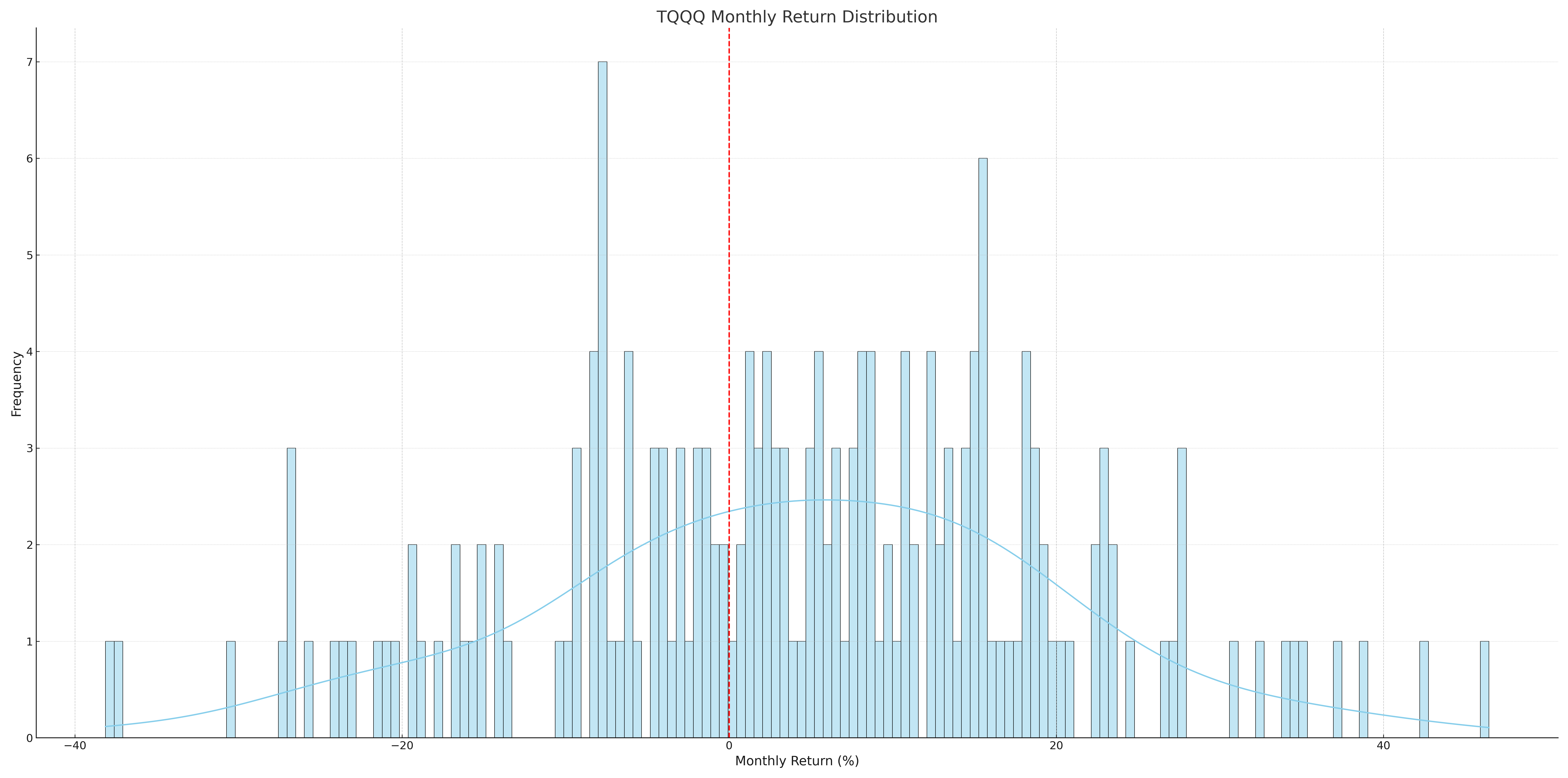 TQQQ:呈現高度尖峯厚尾(fat-tail)特徵,單月跌幅超過 -30%、漲幅超過 +40% 都有出現,明顯違反常態分布假設。