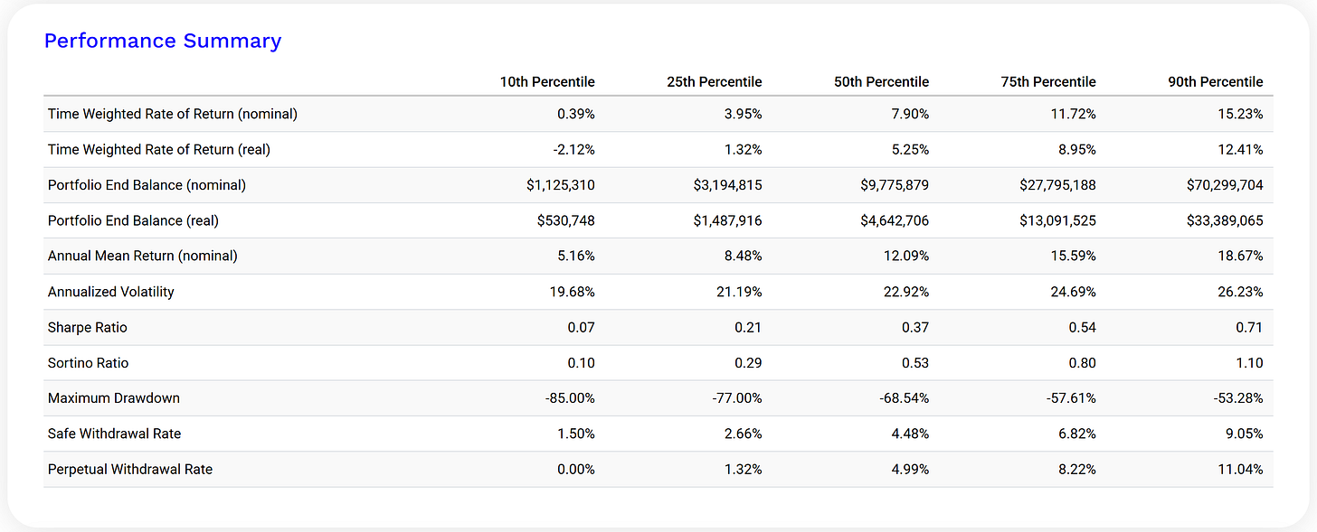 如果模擬結果顯示你的中位數終值是 900 萬,那代表有一半的情境你其實拿不到這麼多。也就是說,這不是「最可能」的結果,而是剛好一半高於它、一半低於它。真正重要的,是那低於它的那一半裡,最差會差到什麼程度?