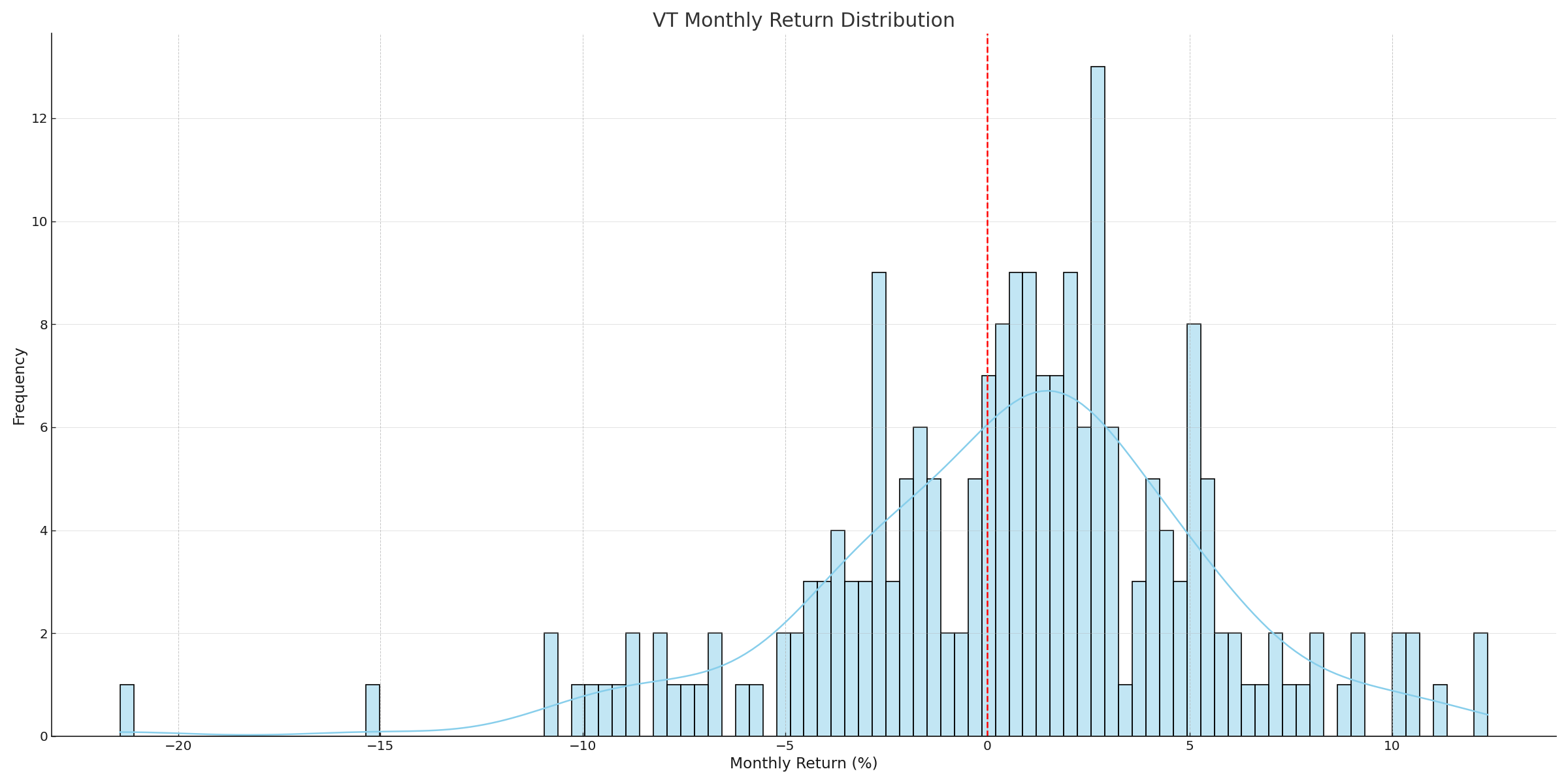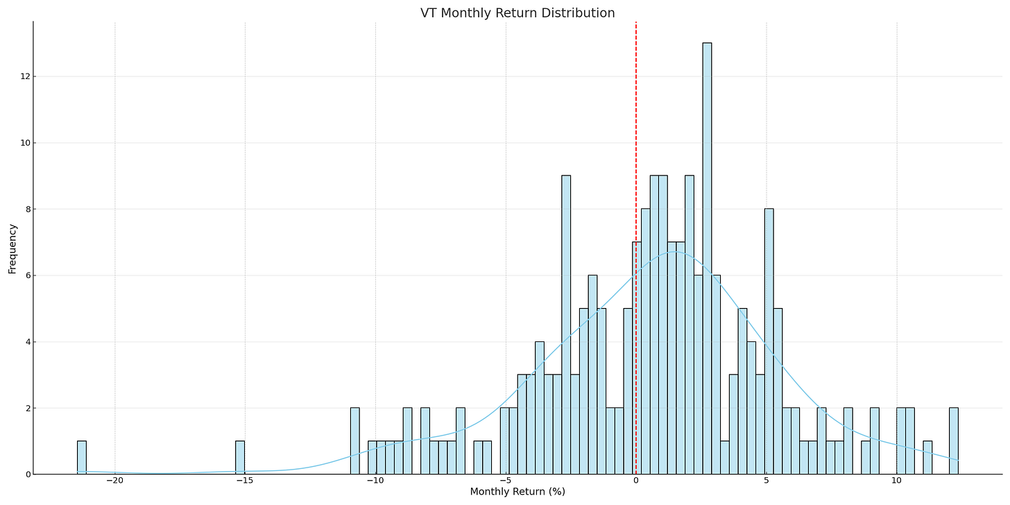 VT:報酬分布偏右,全球配置的特性使其月報酬較集中在 0%~5%,極端正負報酬機率略低。
