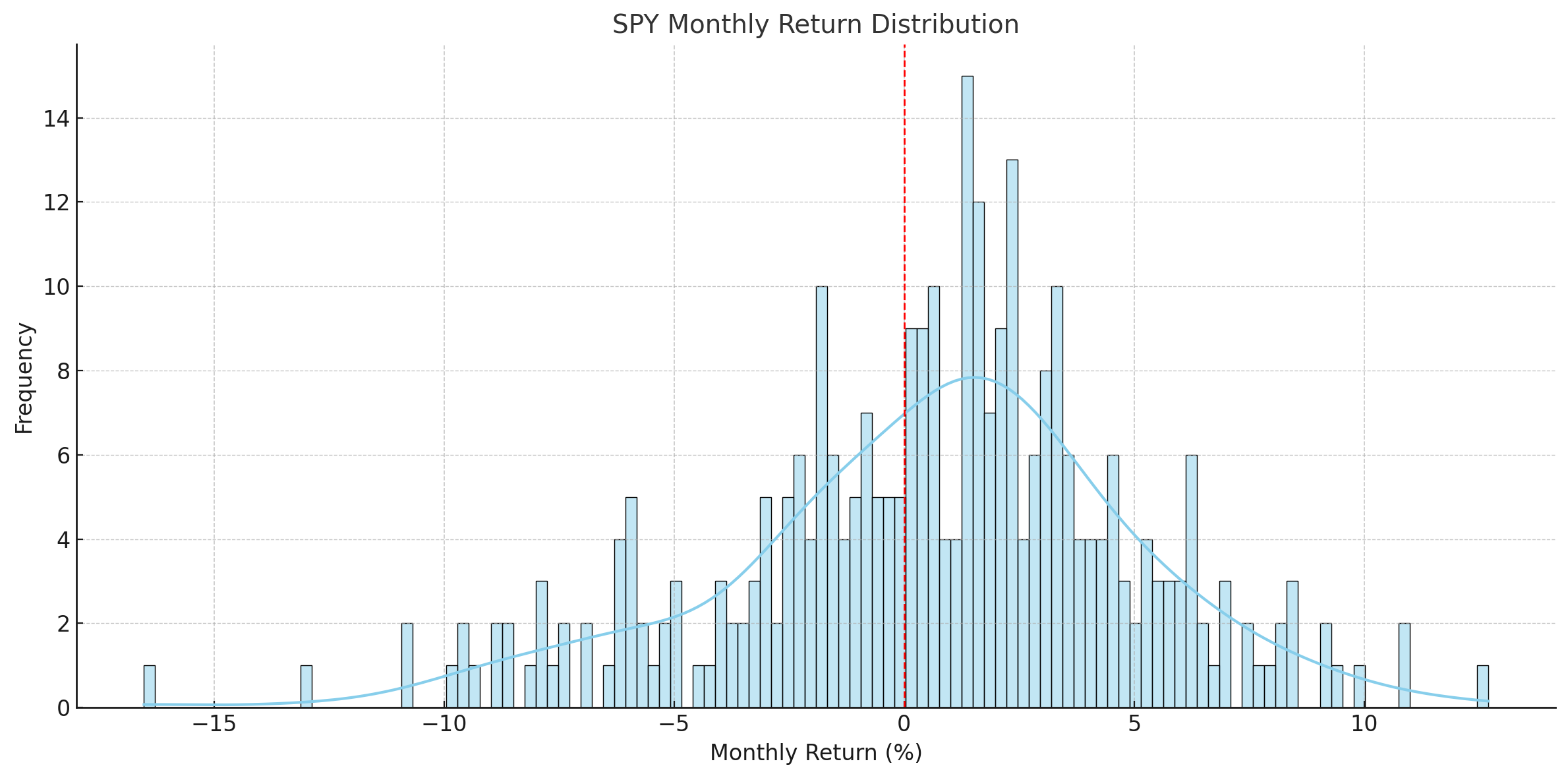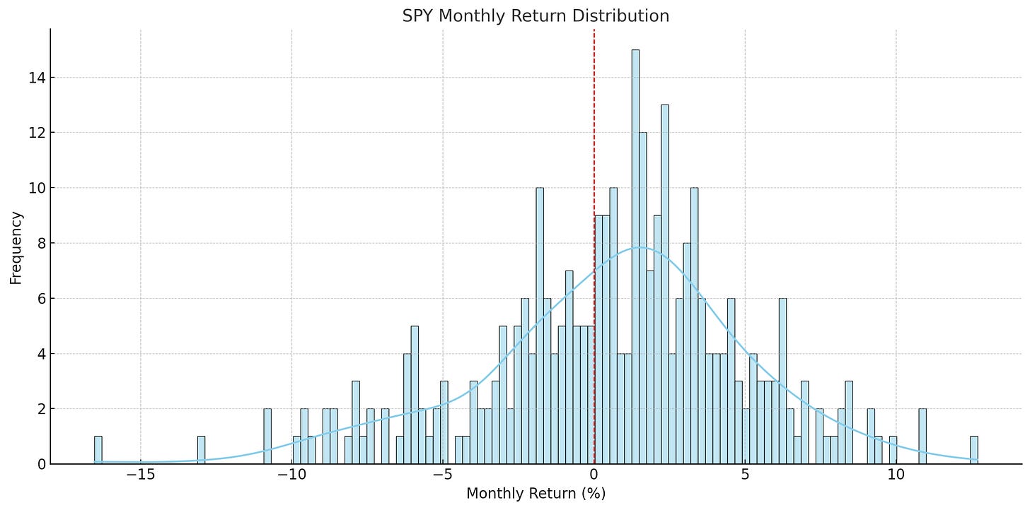 SPY、QQQ:分布大致接近常態,左尾略長,且平均月報酬介於 +0.5%~+1.0%。大盤ETF的波動與下行風險相對可控。