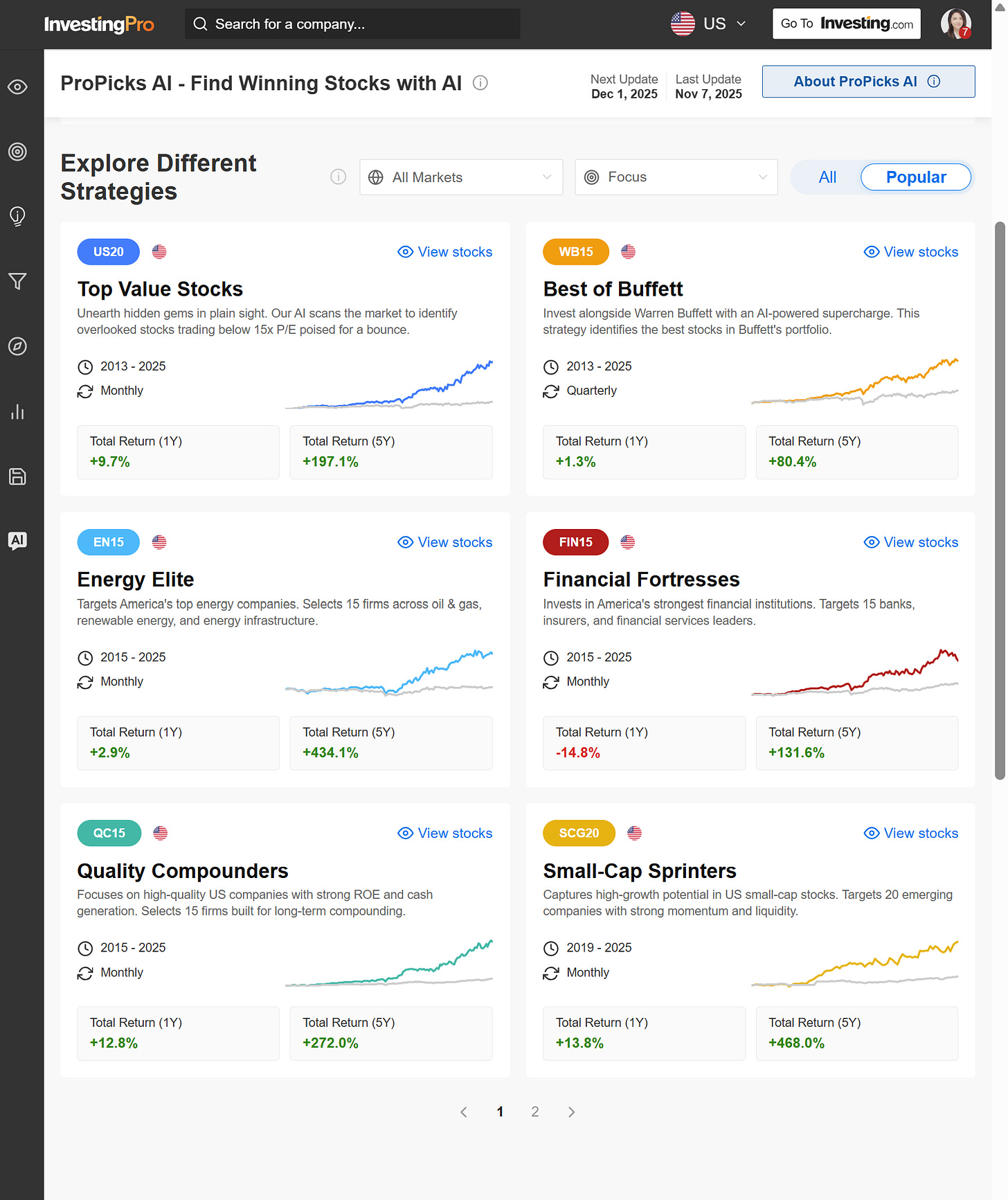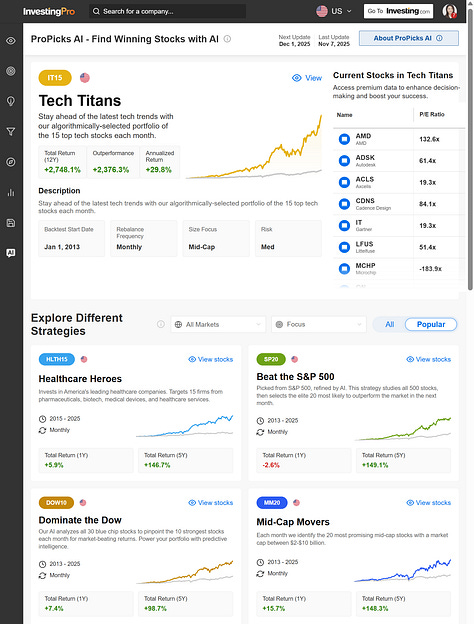 在Investing.Pro 中AI 模型的成果最終會轉化為一系列策略頁面,這正是 ProPicks 的核心介面。